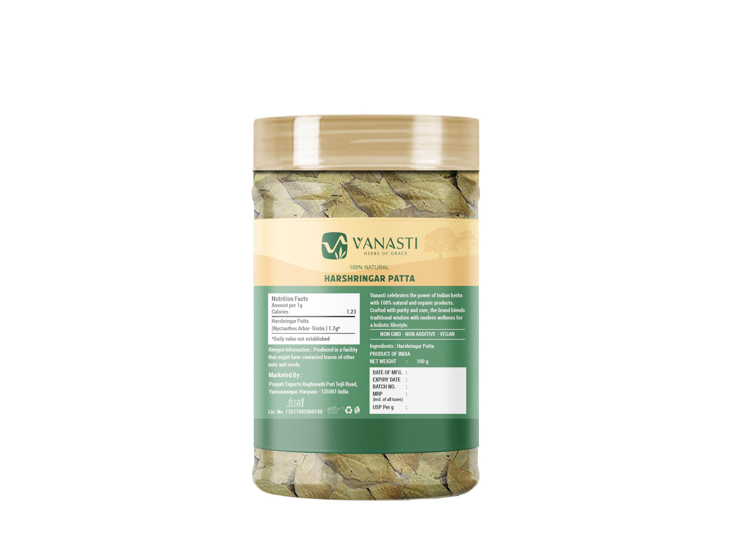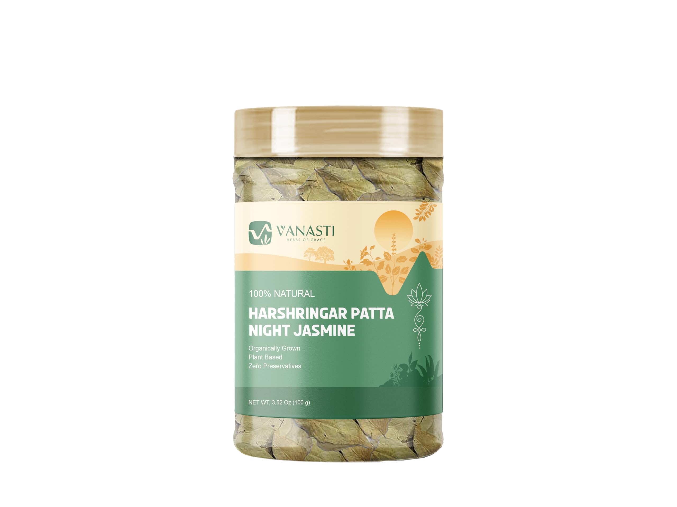 Harshringar Patta (Night Jasmine, Nyctanthes arbor-tristis) is a small tree native to the Indian subcontinent, admired for its fragrant white flowers with orange centers that bloom at night and drop by morning. Its broad green leaves are traditionally used in Ayurveda and local herbal routines. Naturally rich in plant compounds like benzoic acid, flavonoids, and vitamin C, Harshringar holds both cultural and botanical significance across South Asia.