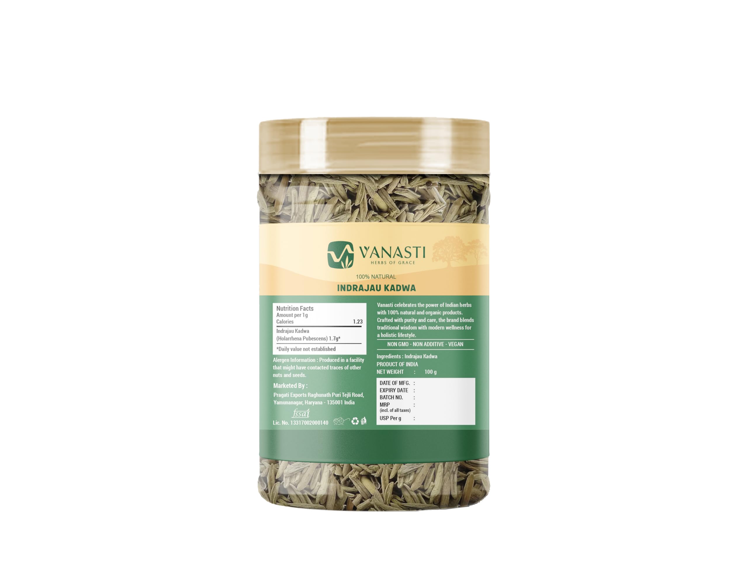 Indrajav Kadwa (Holarrhena antidysenterica) comes from a small tree or shrub native to India and Southeast Asia. It has slender, woody stems and small white flowers. The dried bark and seeds are light brown with a distinctly bitter taste. Commonly found as whole seeds, bark pieces, or powder, Indrajav Kadwa is used as a botanical ingredient in natural herbal mixtures and traditional preparations.