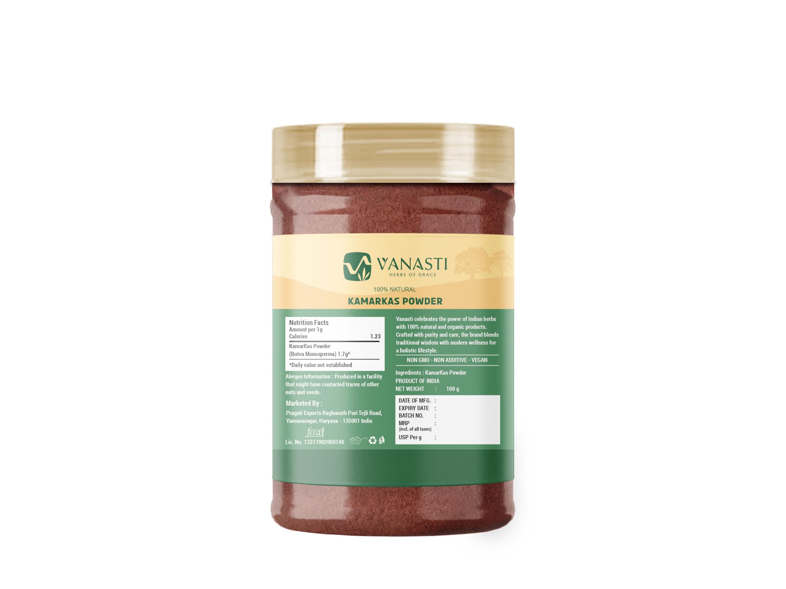 Kamarkas Powder is made from the dried resin of the Butea monosperma tree, also called Gond Chuniya.It has a fine texture and deep red color, with a mild, earthy aroma.This powder is commonly used in dry herbal mixes and special culinary blends.It provides dietary fiber and trace minerals like calcium and iron.Kamarkas Powder is valued for its natural plant source and unique texture.It blends easily into recipes for its color and subtle flavor.