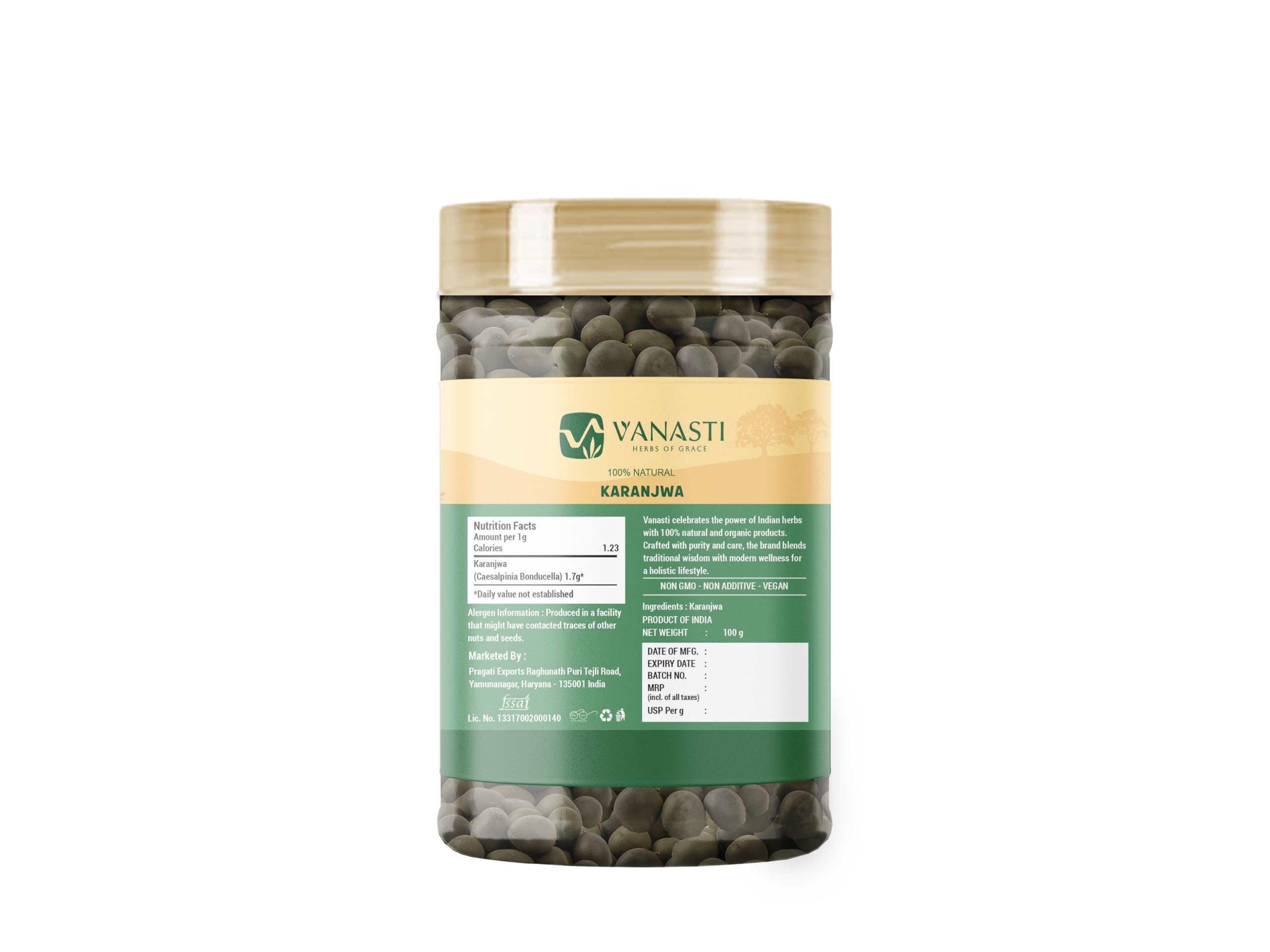 Karanjwa (Pongamia pinnata) is a hardy, medium-sized tree with glossy leaves and brown, oval seeds. The seeds, bark, and flowers contain plant compounds like flavonoids and fixed oils, along with trace minerals. While not commonly used in everyday cooking, parts of the tree are known for their role in natural products and sustainable industries.