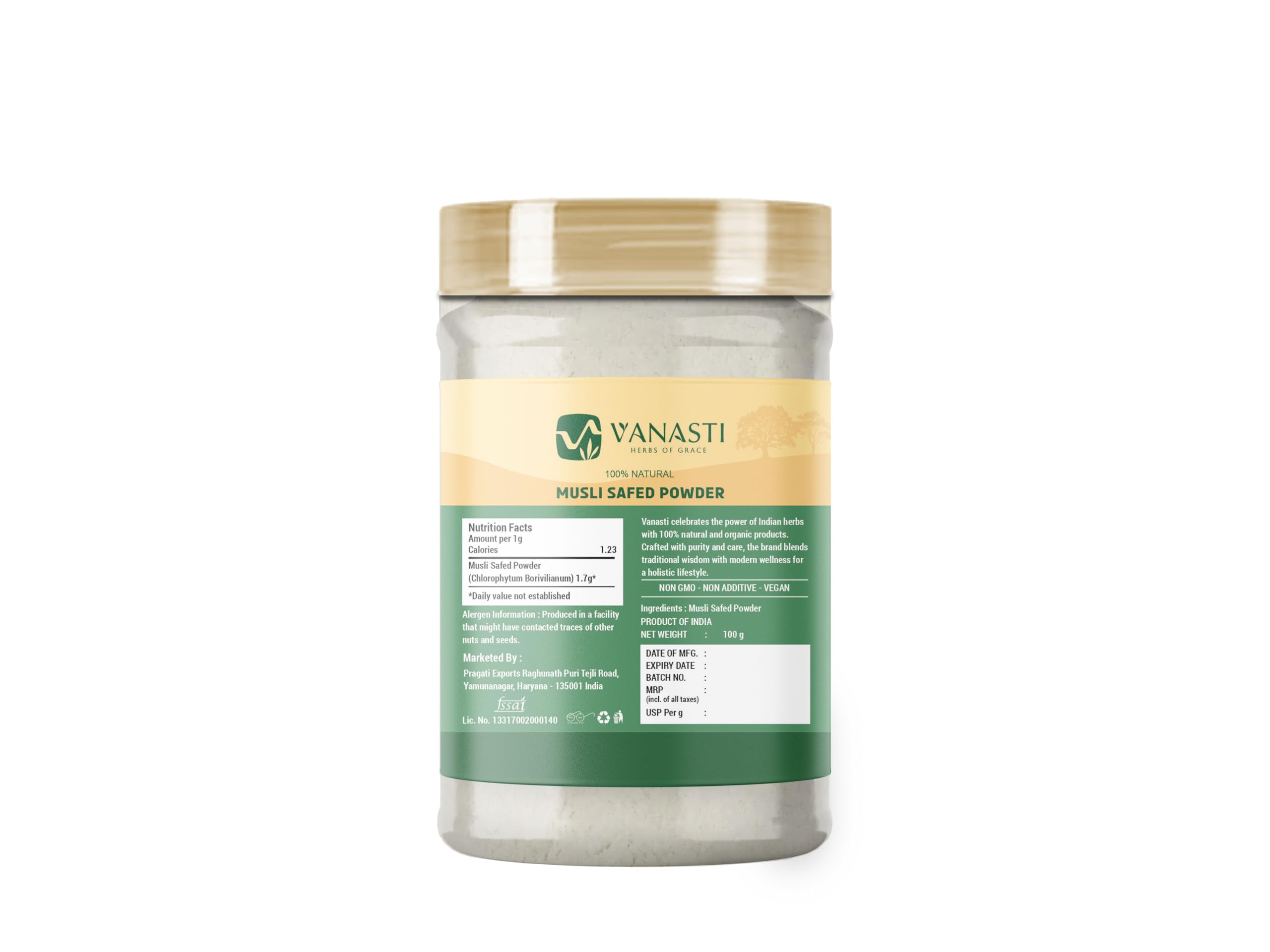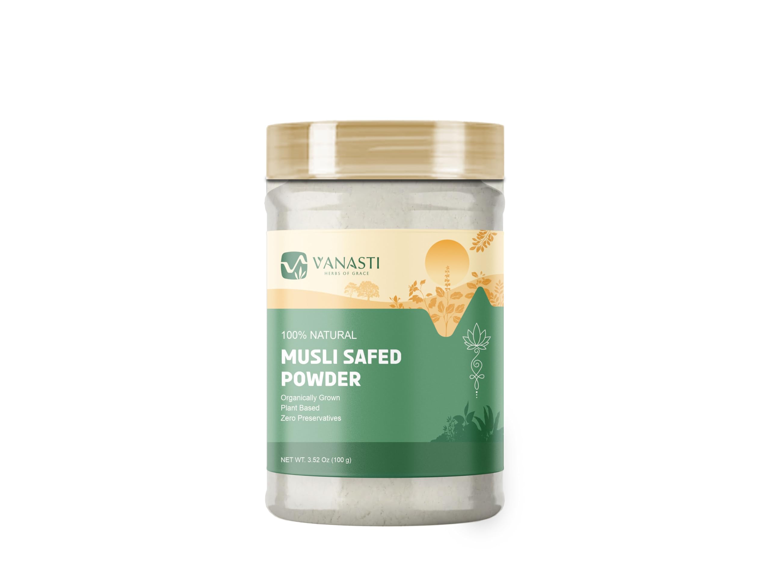 Safed Musli (Chlorophytum borivilianum), also known as White Musli, is a strong adaptogenic herb used in Ayurveda and herbal science. It contains alkaloids, vitamins, and minerals like calcium, potassium, and magnesium, along with resins, phenols, and mucilage. Safed Musli helps strengthen muscles and nourishes the body.