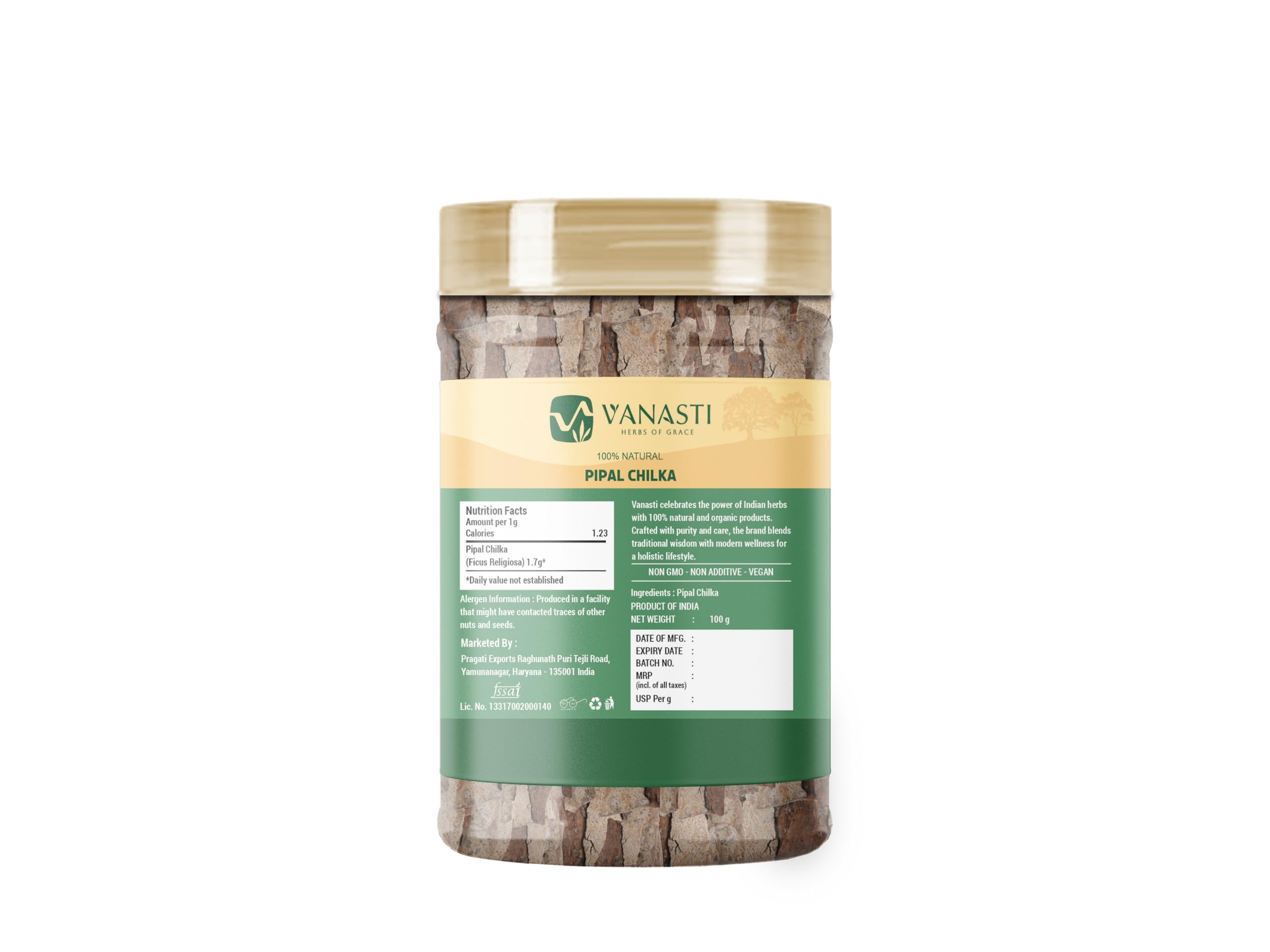 Pipal Chilka is the bark of the Ficus religiosa tree, also known as Peepal. Native to the Indian subcontinent, this tree has smooth, gray bark that peels in flakes and features heart-shaped leaves. It grows well in sunlight and adapts to many soils. The bark contains natural plant compounds, mainly antioxidants, and is sometimes used in traditional mixtures.