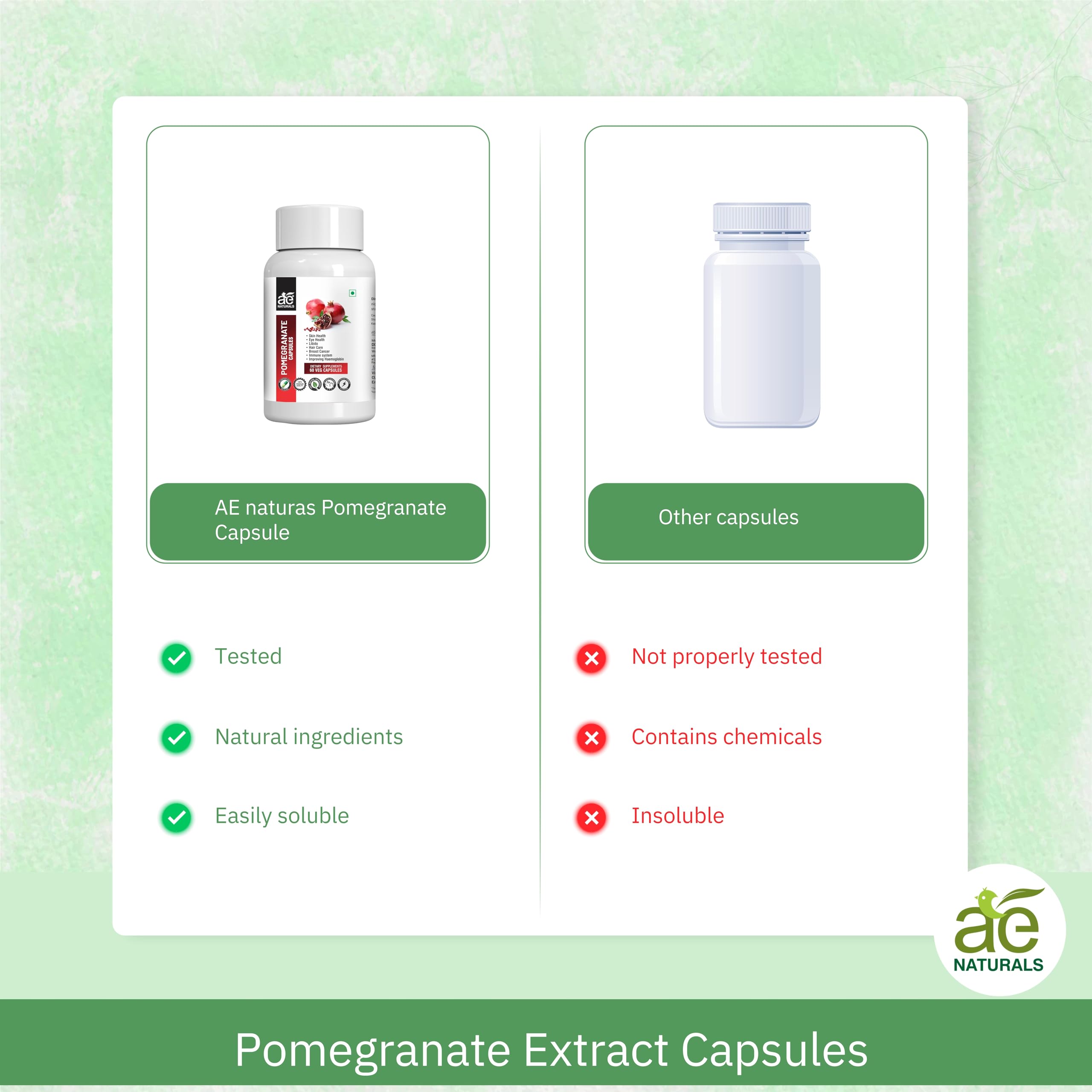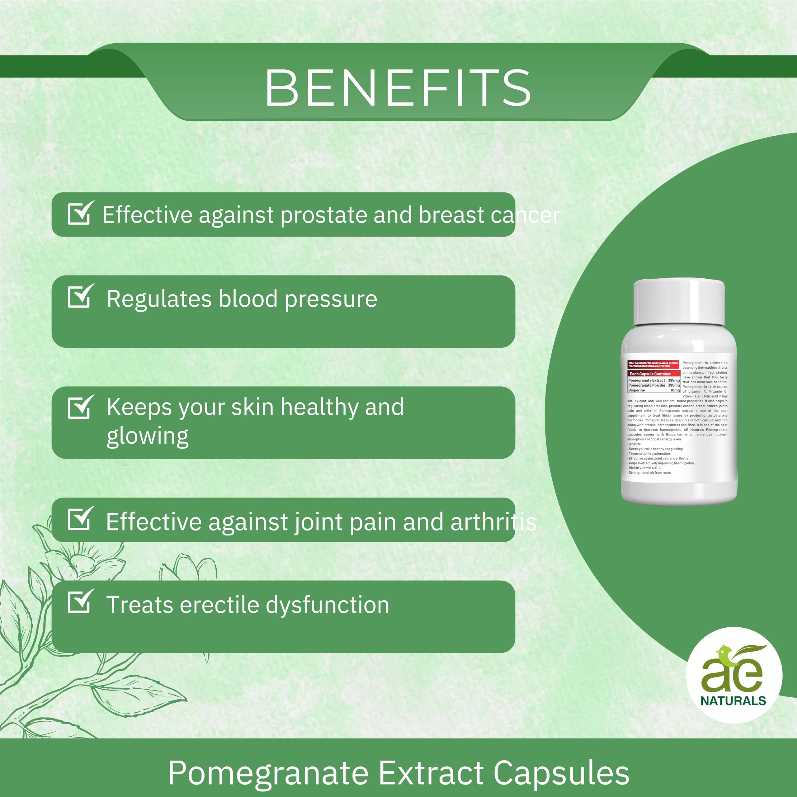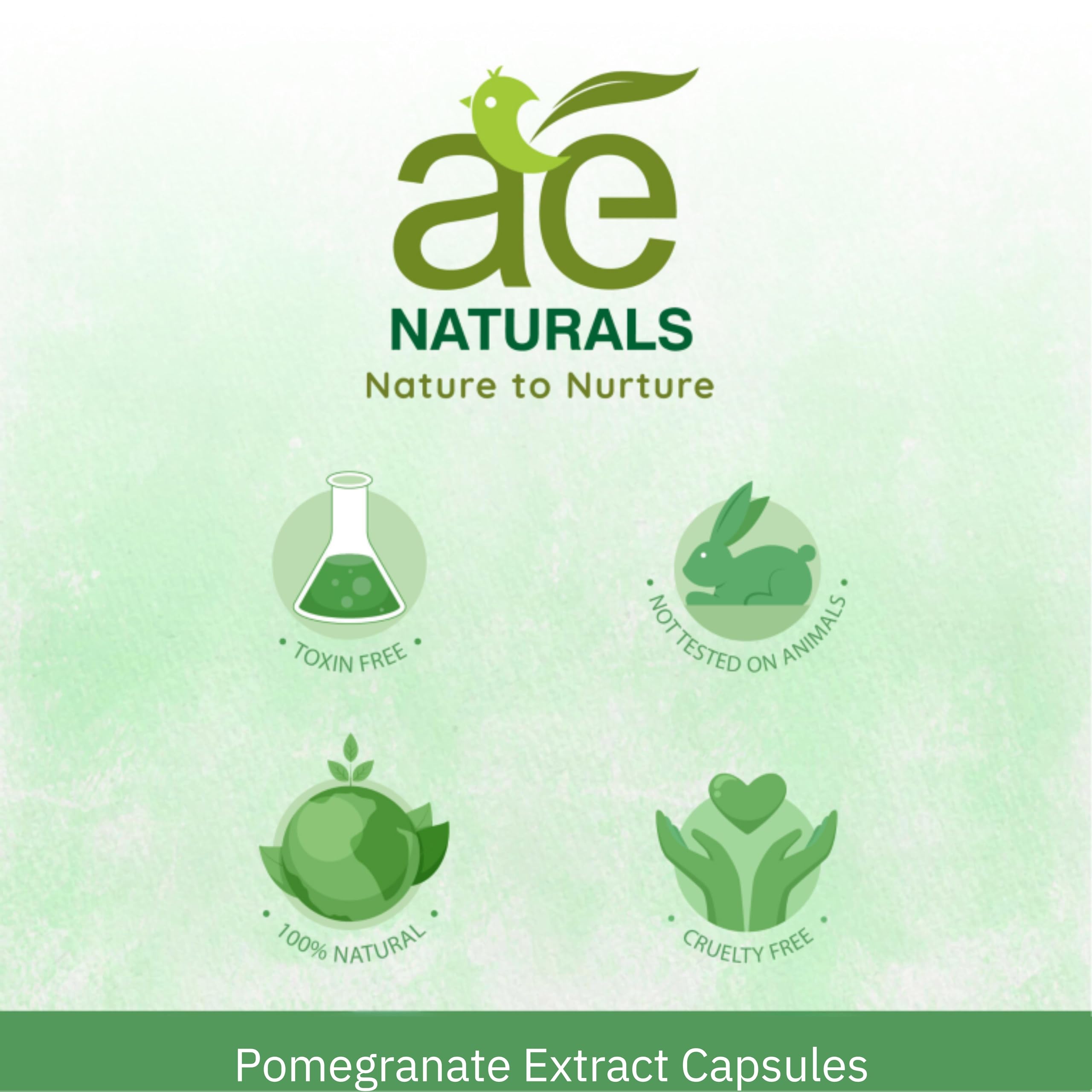 Experience the numerous benefits of AE Naturals Pomegranate Extract Capsules derived from fresh pomegranate fruit. Packed with minerals vitamins essential compounds and fiber these capsules provide a convenient way to harness the power of pomegranate. The antioxidants such as punicic acid and punicalagin protect the body from diseases and promote overall well-being. Achieve healthy and glowing skin regulate blood pressure and combat joint pain. Incorporate AE Naturals Pomegranate Extract Capsules into your daily routine for a vibrant and revitalized you.