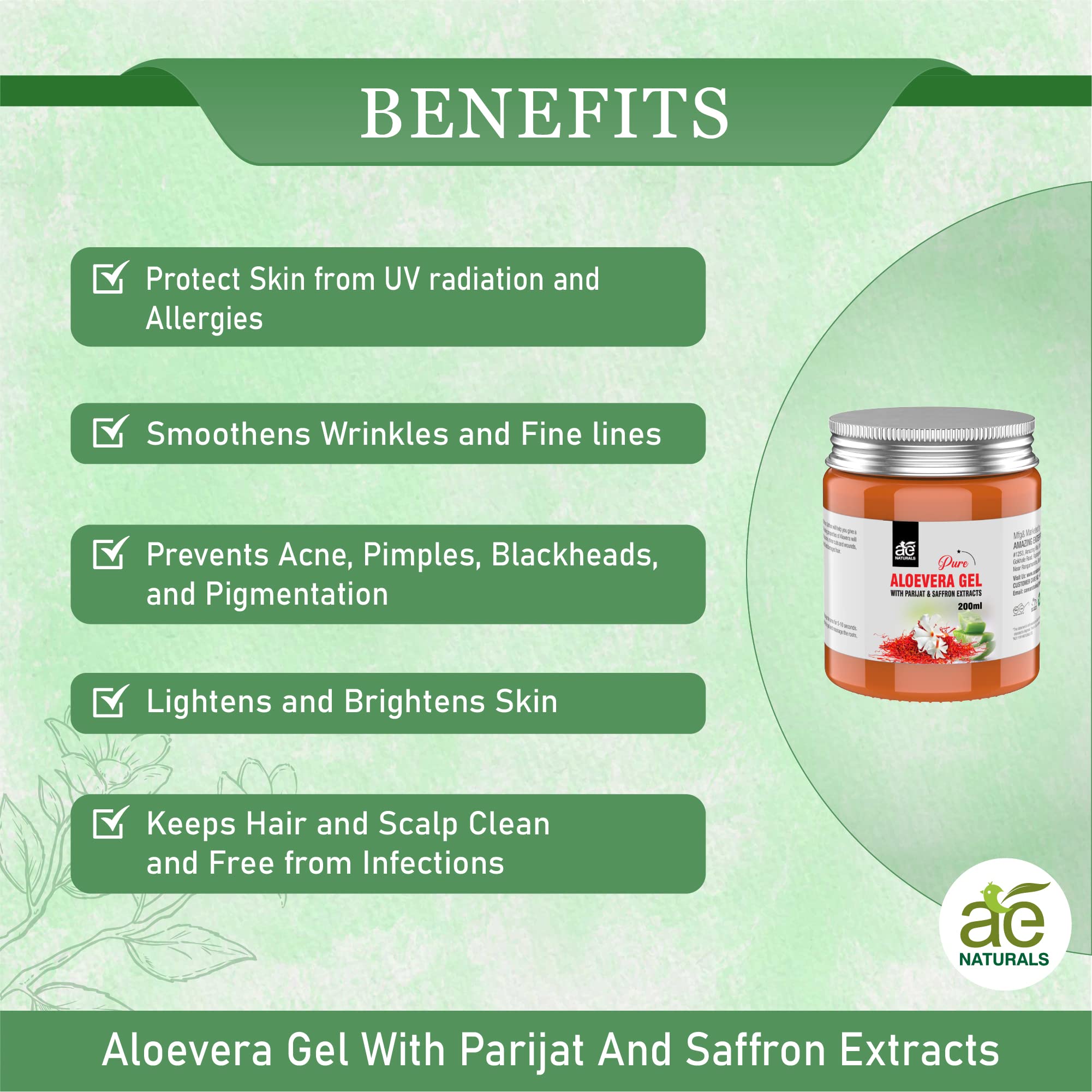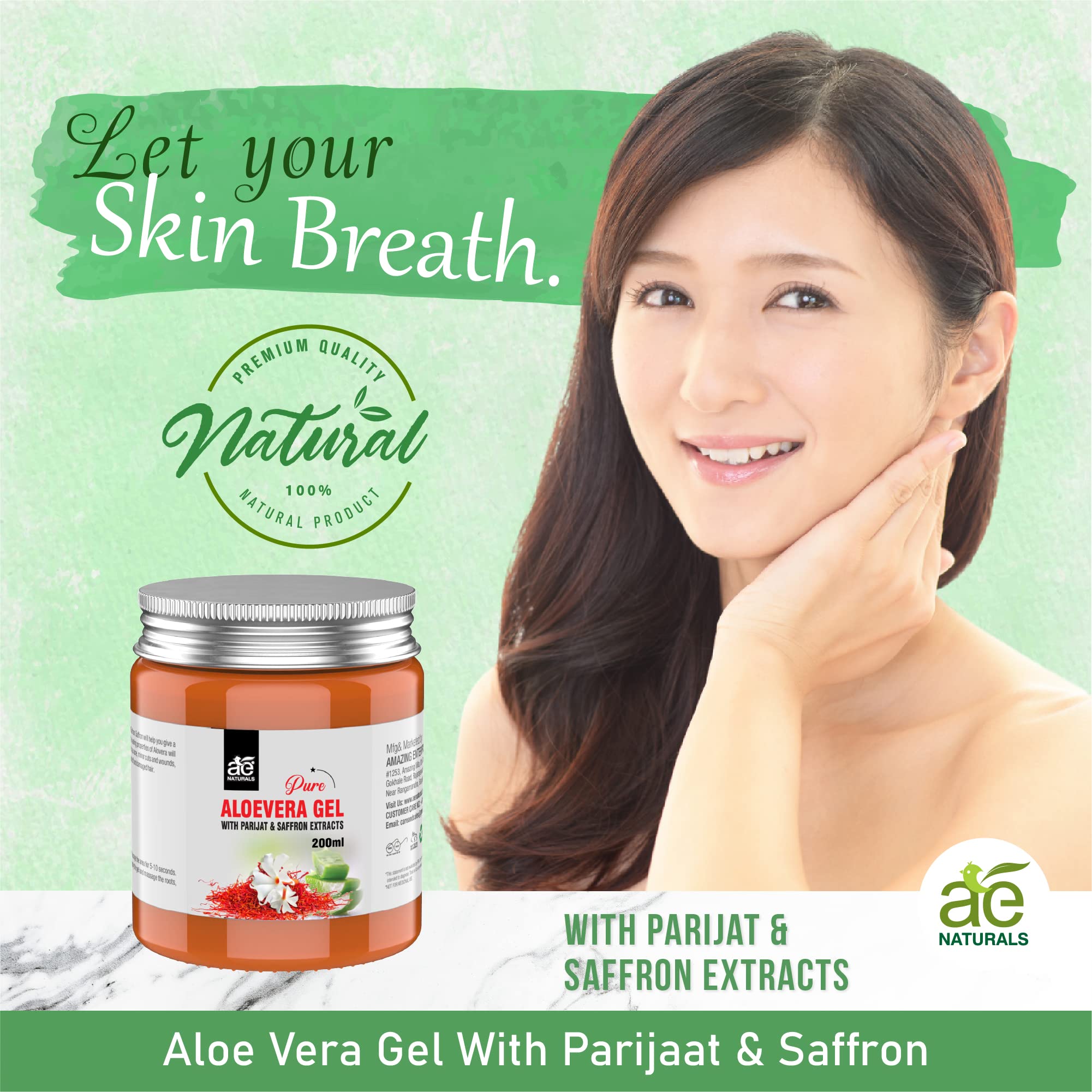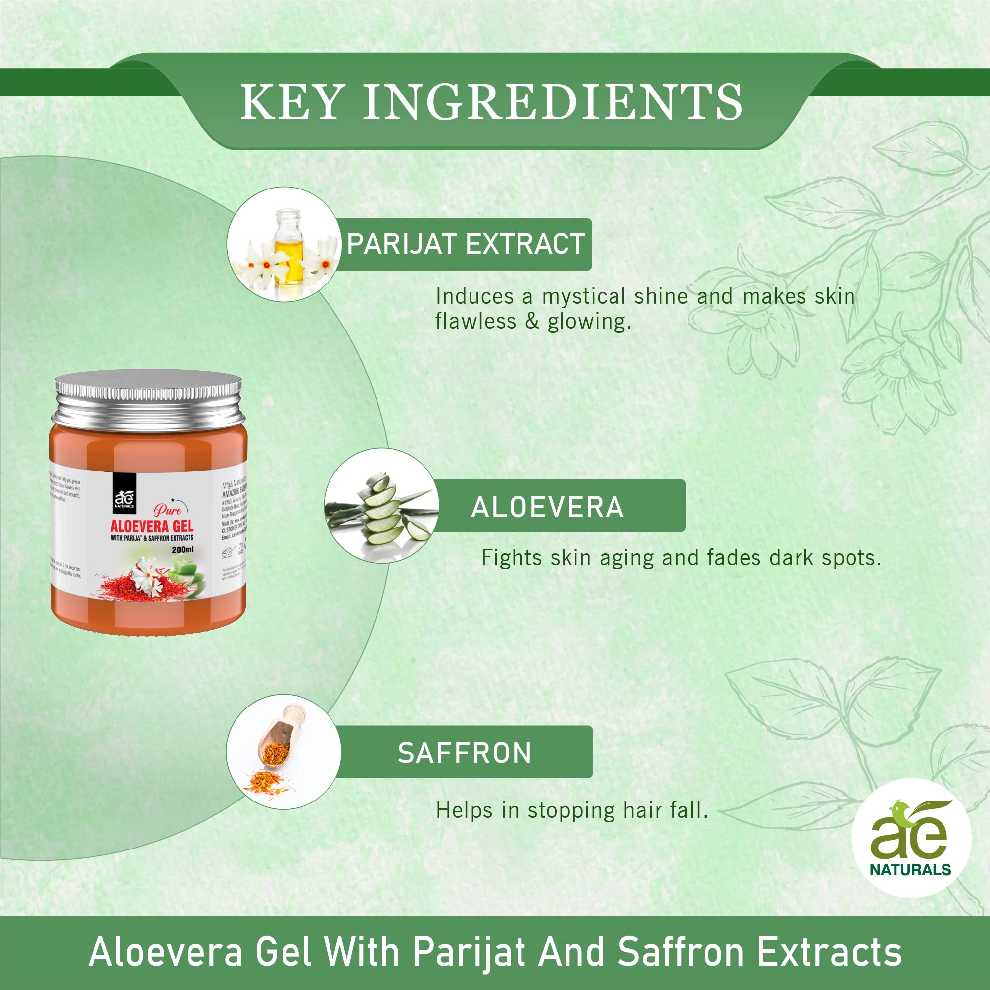 HomeHealth & PersonalDiet & NutritionHealth SupplementsAE Naturals Pure Aloe Vera Gel with Paarijat and Saffron 200ml All-in-One Gel Moisturizer for Face Body and Hair | Non-Sticky Hydrating and Transparent | Suitable for All Skin Types | Anti-Ageing Acne Prevention and Daily Nourishment (Pack of 1)