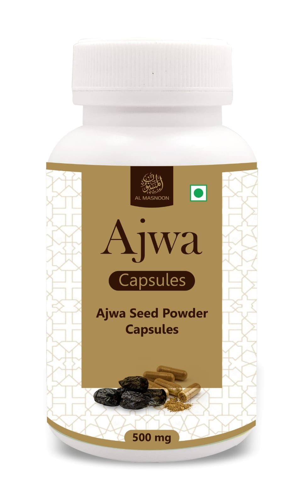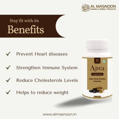 Experience the nutritional power of Al Masnoon Ajwa Seed Capsules each containing 500mg of pure Ajwa seed powder in a convenient vegetarian capsule form. Ajwa dates are renowned for their health benefits making these capsules a natural choice for enhancing overall wellness.Incorporate Al Masnoon Ajwa Seed Capsules into your daily routine to harness the natural goodness of Ajwa seeds and support your overall health and vitality.