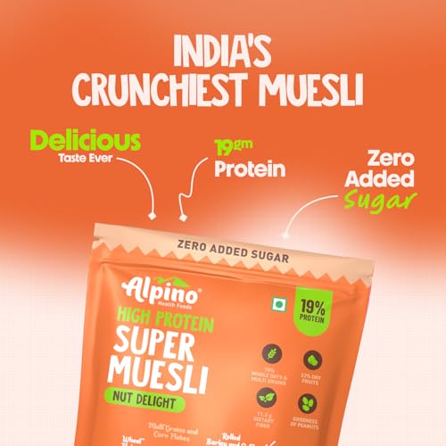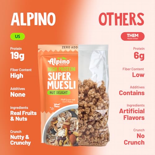 Alpino Health Foods Alpino Super Muesli Nut Delight 400 G | 20% Dried Fruits & Nuts | 69% Whole Grain Breakfast Cereal | High in Iron | Source of Fibre | Finest Nuts & Raisins | No Sugar Infused Fruits
