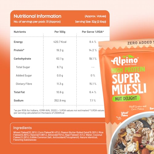 ALPINO Super Muesli Nut Delight 750g - 69% Whole Grain, 20% Dried Fruits & Nuts, No Sugar Infused Fruits - High Protein, Fibre Source - Premium Breakfast Cereal | Seen on Shark Tank India