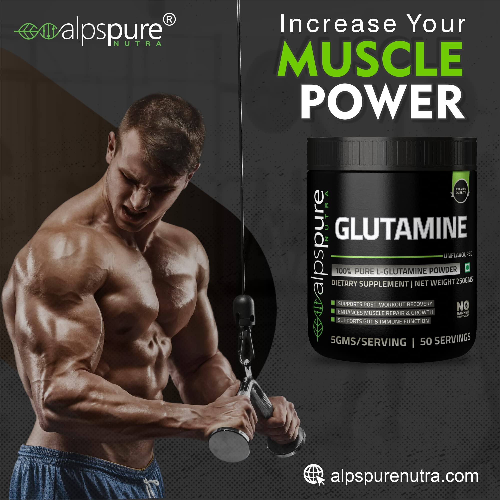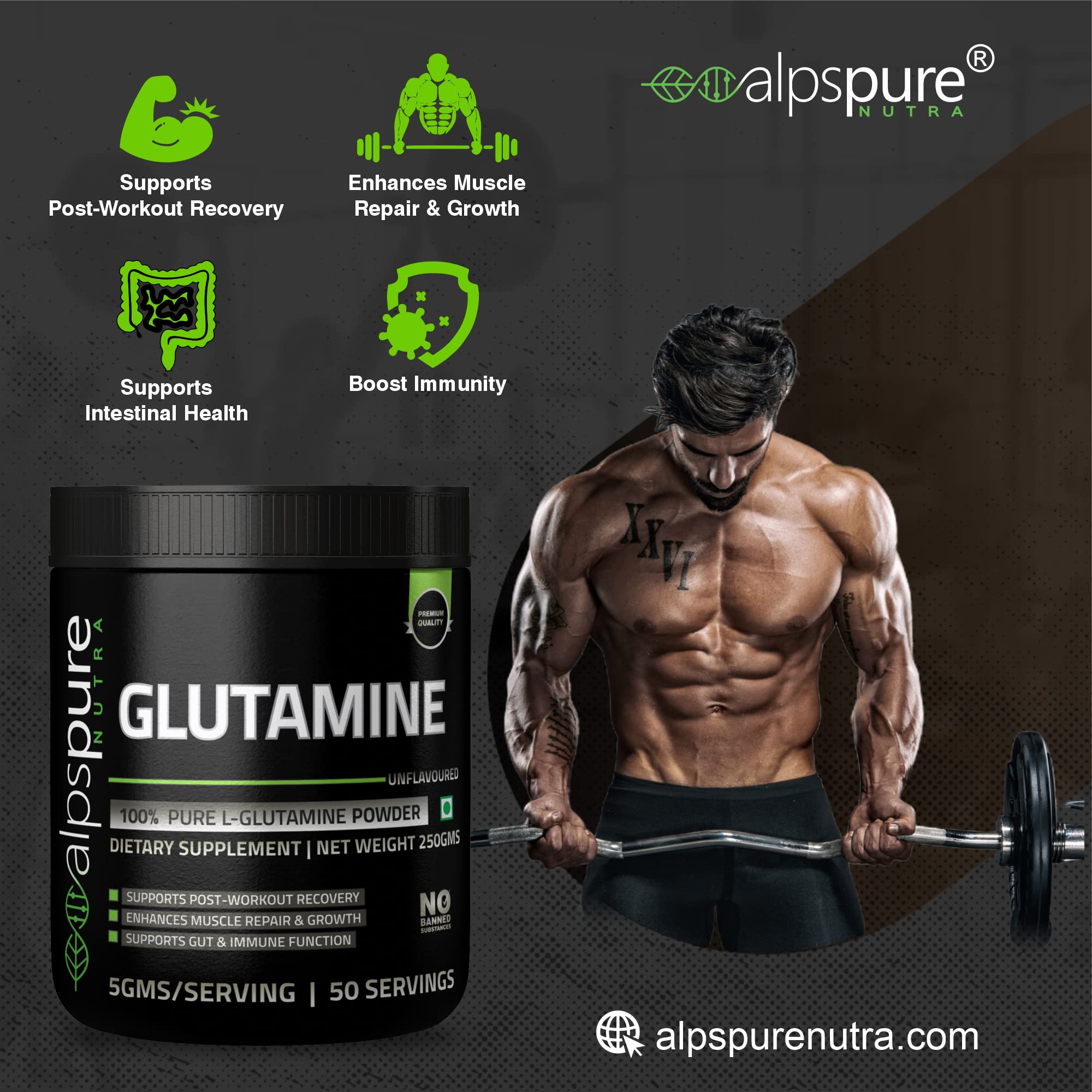 Alpspure Nutra 100% Pure Glutamine Powder (250 G) Unflavoured | Post Workout Supplement for Muscle Growth & Recovery | Sports & Fitness Nutrition for Men & Women | L-Glutamine | Amino acid