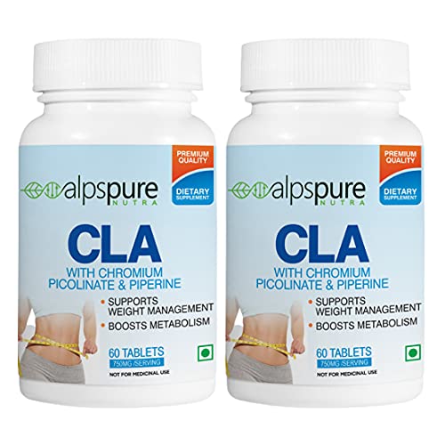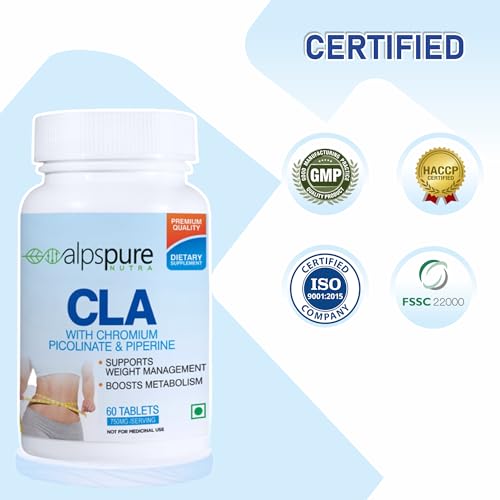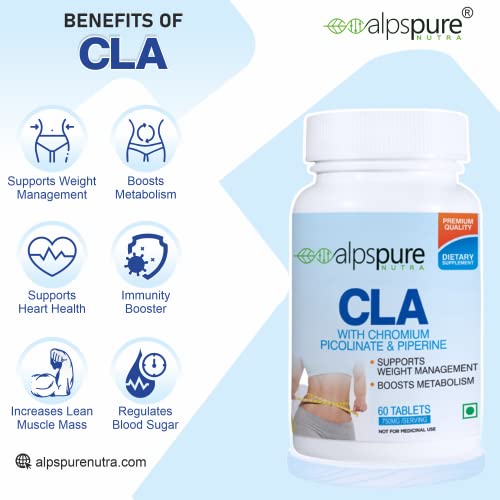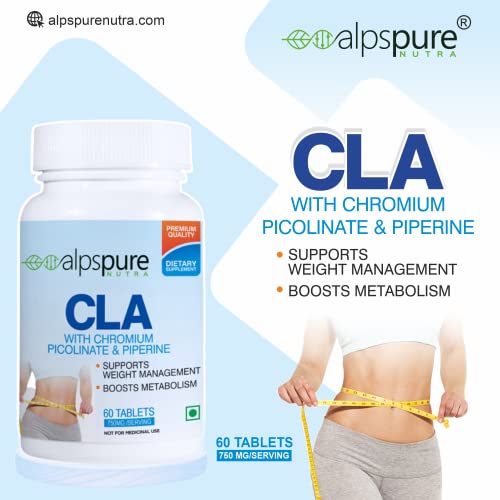 Alpspure Nutra CLA Tablets 750Mg Fat Burner With Chromium Picolinate, Piperine, Supports Weight Management - 120 Tablets