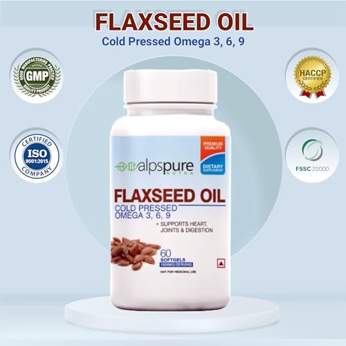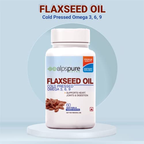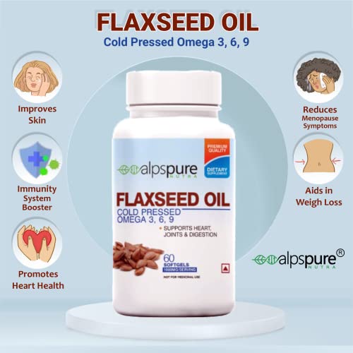 Alpspure Nutra Flaxseed Oil 1000Mg Omega 3-6-9 (60 Softgel Capsules) | Cold Pressed | Natural Omega 3,6,9 Supplement | Promotes Healthy Heart, Joints, Skin, Brain & Digestion | For Men & Women