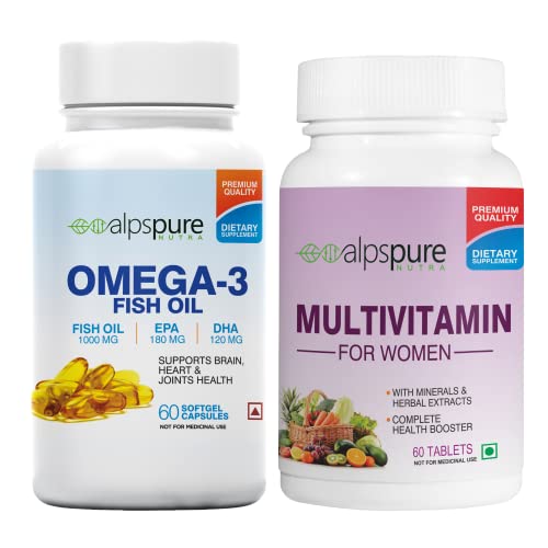 Alpspure Nutra Omega 3 Fish Oil 1000mg 60 Softgel Capsules 180-120 and Multivitamin women 60 Tablets Health Booster Complete Health Booster pack (Combo)