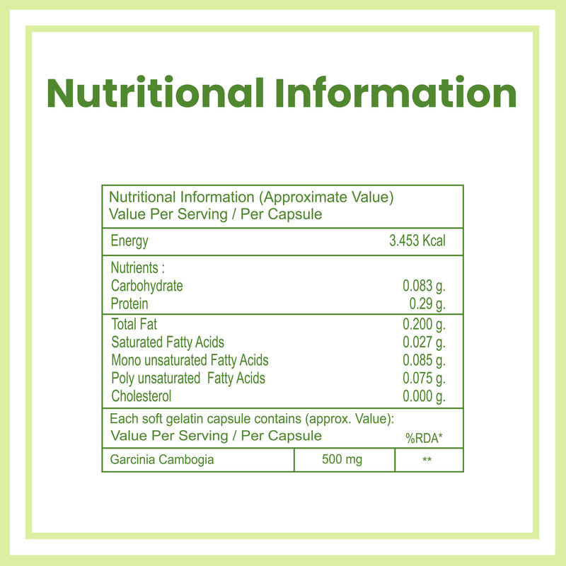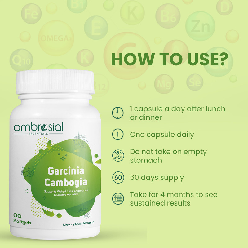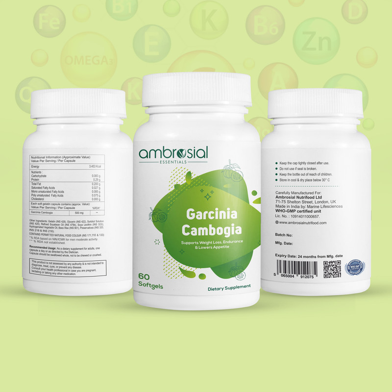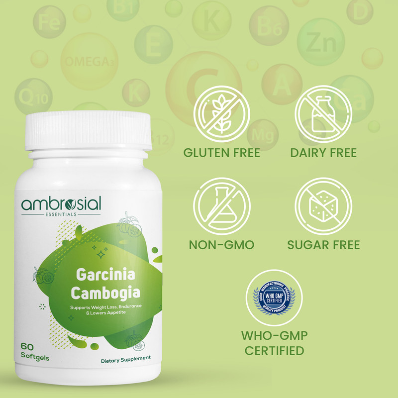High-potency Ambrosials Garcinia Cambogia containing 60 fast active soft gelatin capsules with a standard 60% HCA combined with calcium and potassium properties. Garcinia Cambogia Contains 500mg per capsule.