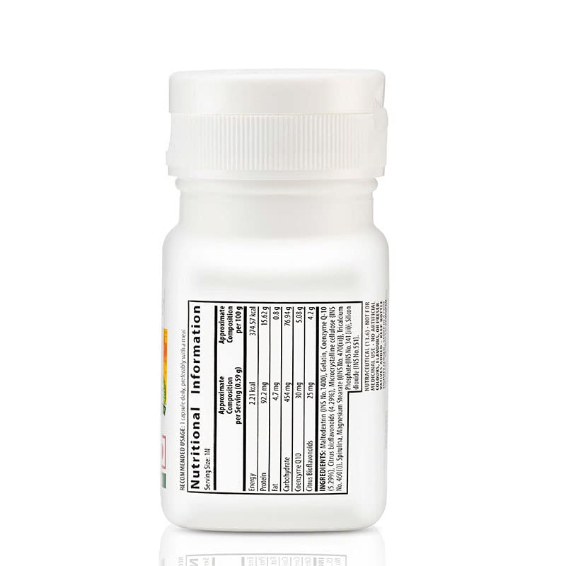 Nutrilite coenzyme q10 an excellent source of coenzyme q10 that supports the energy production in cell and is also a potent antioxidant. Supports healthy heart and every other cell in the body an excellent source of coenzyme q also contains exclusive nutrilites citrus bioflavonoids per serving provides 30 mg of coenzyme q10 which enables cells to produce energy they need to perform optimally. It is a potent antioxidant and neutralizes free radical damage per serving contains 25 mg of citrus bioflavonoids for additional benefits of phytonutrients benefit nutrilite coenzyme q10 is an excellent source of coenzyme q10 that supports the energy production in cell and maintains the energy levels in the cell. Several clinical studies with coenzyme q10 have demonstrated positive effects by enhancing heart health. Getting sufficient coq10 ensures that your heart muscles cells will pump efficiently and give you a healthy heart. It is a potent antioxidant and neutralizes free radical damage supporting a strong heart begins with promoting strong heart cells. Take nutrilite coenzyme q10 every day along with balanced diet and healthy lifestyle to support healthy heart and every other cell in your body use instruction one capsule daily preferably with meal 45 capsules.