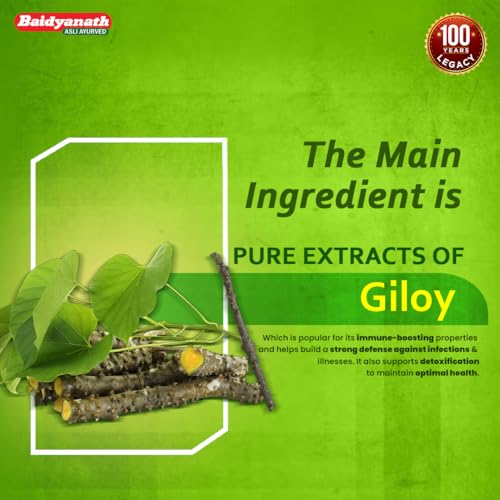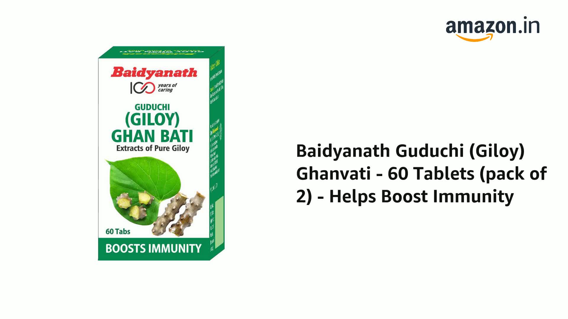 Design:Giloy Ghan Bati 120 TabsBaidyanath Giloy Ghan Bati is beneficial for easing pitta imbalances like the burning sensation of hand and feet allergic reactions skin and acidity. Baidyanath Giloy Ghan Bati is solely made up with ¢Giloy also known as Guduchi a popular herb in the ayurvedic world. It has been used in ancient herbal mediciines and is known for its anti-arthritic antipyretic deigestive anti-inflamtory iron ting properties.