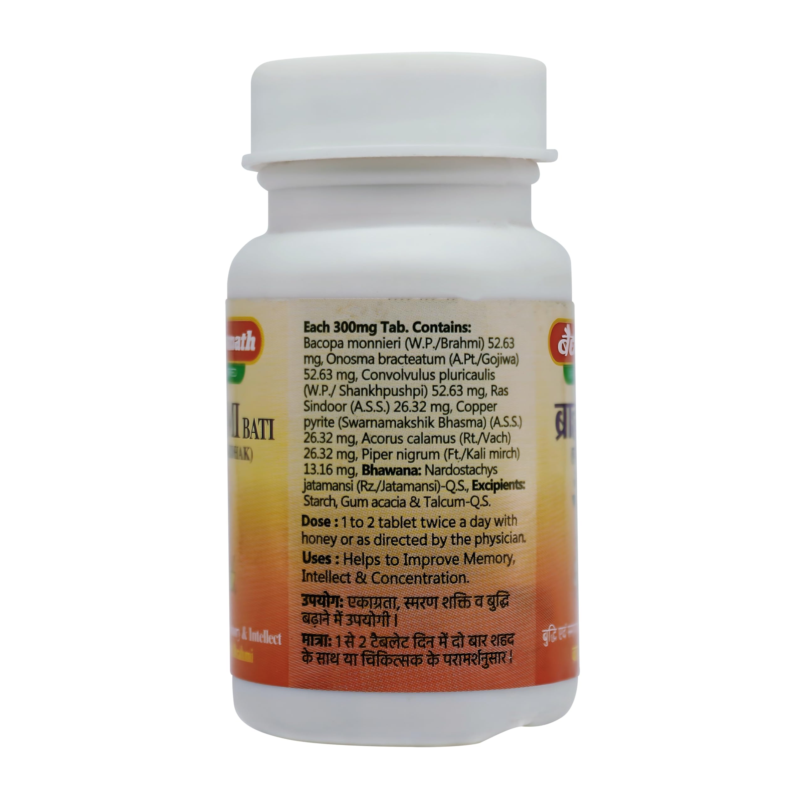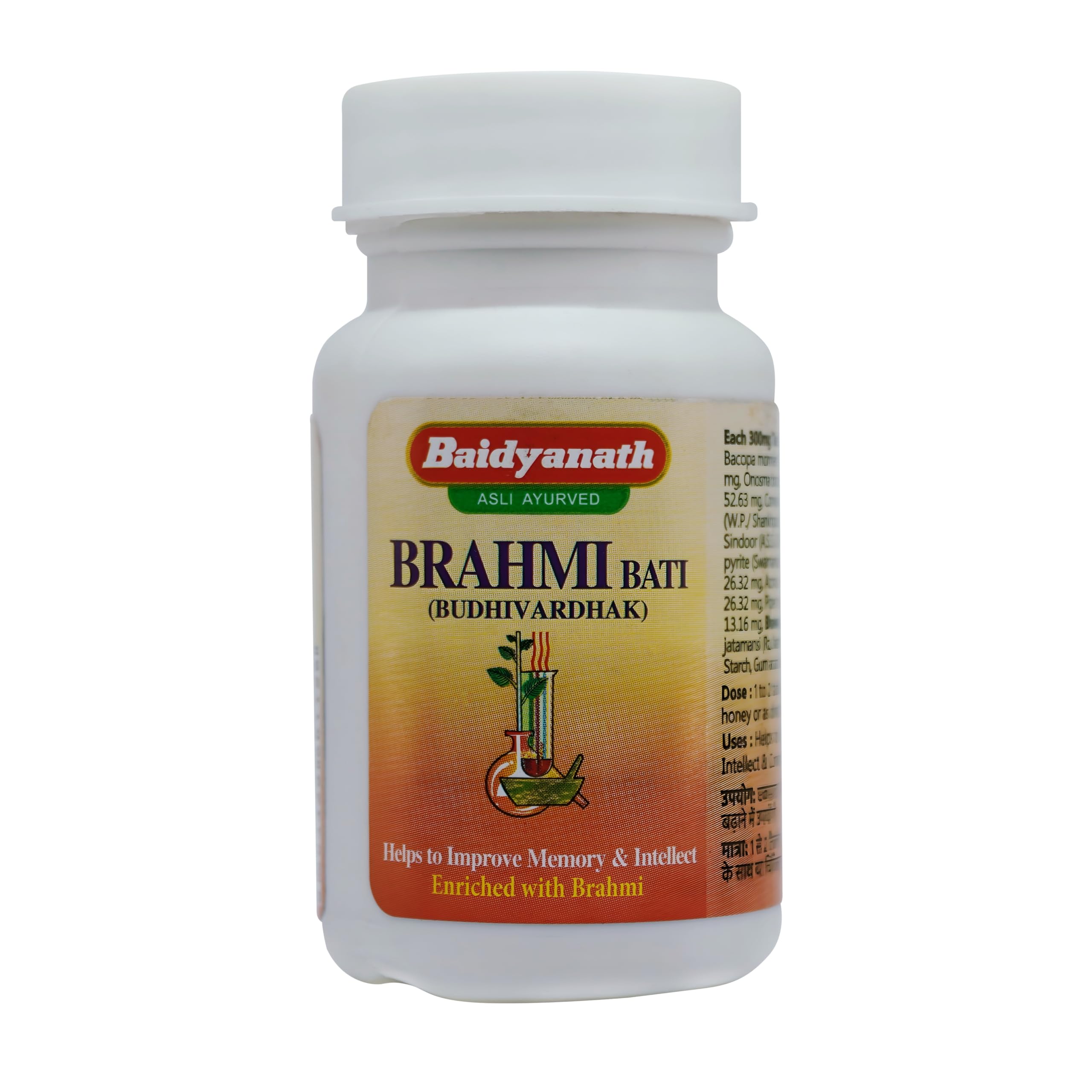 Baidyanath (Jhansi) Brahmi Bati active contains BrahmiSankhapuspi (Evolvulus alsinoides) Marica (Piper nigrum)Svarnamaksika bhasma (Calcinated and purified copper pyrites)Rasa sinduraGava java. Brahmi Bati is the superior Suvarnakalpa with excellent Medhya Mastishkabalya & Rasayan Dravyas like Brahmi & Suvarna Bhasma. It may relieves mental stress & fatigue with the Balya & Shamak action on Mastishka & Sanjnyavahi nadis. Enhances the capacity of sensory as well as motor organs & promotes intelligence & memory. Brahmi Bati may useful in Unmada Apasmar Bhrama Akshepak Manodaurbalya Insomnia Smrutimandya Mental stress Anxiety fatigue.