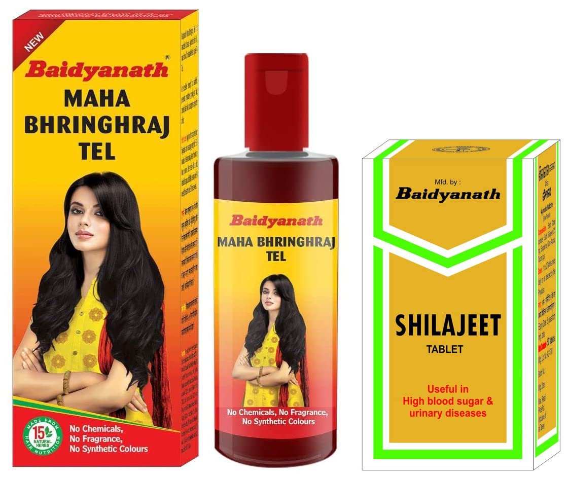 Baidyanath Mahabhringraj Tel (Original) | Hairfall Control | Ayurvedic Medicated Hair Oil | 4X More Effective | For All Hair Types (Male & Female) - 200mlBaidyanath Mahabhringraj Tel is considered really effective for promotoing overall hair health. Made up of best quality herbs Mahabhringraj tel not only helps the hair look shiny and lustrous but nourishes it from within. Mahabhringraj oil is also know to relieve pressure from the multiple pressure points present in the scalps. Mahabhringraj Oil considered best for advanced hair care contains hand plucked hair freindly ayurvedic herbs that prevent hair damage.Baidyanath Shilajeet (Shilajit) - 50 TabletsIngredients : Sudh ShilajeetGum Acacia (Excipients )Talcum (Excipient )