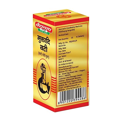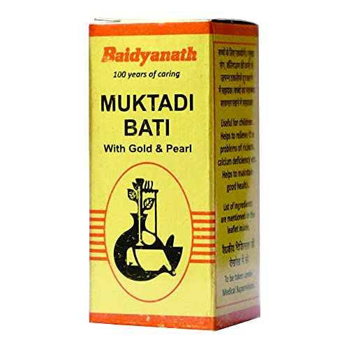 Baidyanath Muktadi Bati with Gold & Pearl - 10 Tablets. One of Indiaâs most respected Companies Shree Baidyanath Ayurved Bhawan Pvt. Ltd. (Kolkata) popularly known as Baidyanath is the acknowledged leader of Ayurvedic know-how. Established in 1917 the Company has played a pioneering role in re-establishing ancient knowledge with modern research and manufacturing techniques. AYURVEDA is a 5000 year old Science of health care and herbal treatment. AYURVEDA is highly effective in common and complicated ailments assures long term relief and has no side effects. AYURVEDA is now backed by modern scientific research and technologies and provides its gentle healing touch to millions around the world.