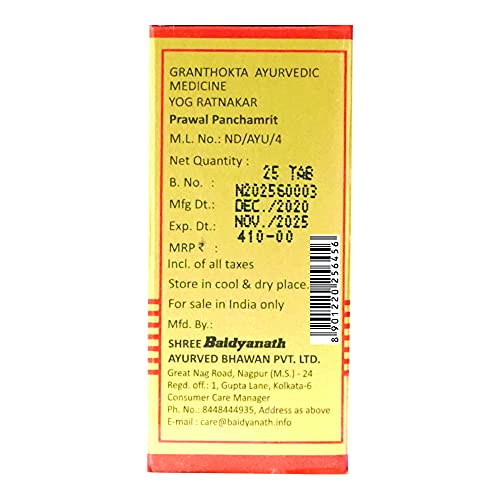 Baidyanath Prawal Panchamrita My -25 Tablets. One of Indiaâs most respected Companies Shree Baidyanath Ayurved Bhawan Pvt. Ltd. (Kolkata) popularly known as Baidyanath is the acknowledged leader of Ayurvedic know-how. Established in 1917 the Company has played a pioneering role in re-establishing ancient knowledge with modern research and manufacturing techniques. AYURVEDA is a 5000 year old Science of health care and herbal treatment. AYURVEDA is highly effective in common and complicated ailments assures long term relief and has no side effects. AYURVEDA is now backed by modern scientific research and technologies and provides its gentle healing touch to millions around the world.