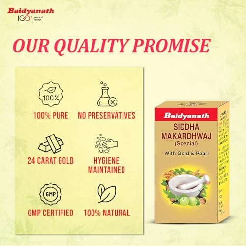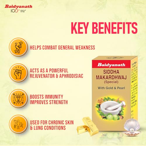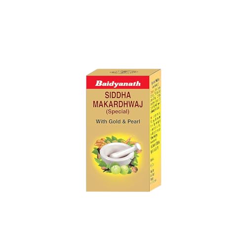 Baidyanath Siddha Makardhwaj Special is an Ayurvedic formulation that helps combat general debility and weakness in the body. It is fortified with Gold and Pearl that helps rejuvenate the body and helps in keeping you healthy and active. Dosage intructions have been mentioned on the product pack or as directed by Ayurvedic practitioner.