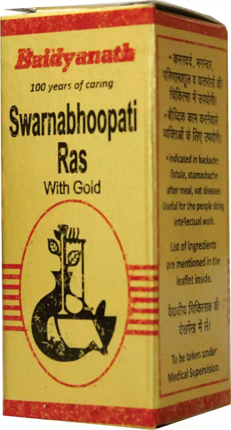 Baidyanath Swarnabhoopati Ras Sy-5 Tab. One of India;s most respected Companies Shree Baidyanath Ayurved Bhawan Pvt. Ltd. (Nagpur) popularly known as Baidyanath is the acknowledged leader of Ayurvedic know-how. Established in 1917 the Company has played a pioneering role in re-establishing ancient knowledge with modern research and manufacturing techniques. AYURVEDA is a 5000 year old Science of health care and herbal treatment. AYURVEDA is highly effective in common and complicated ailments assures long term relief and has no side effects. AYURVEDA is now backed by modern scientific research and technologies and provides its gentle healing touch to millions around the world.