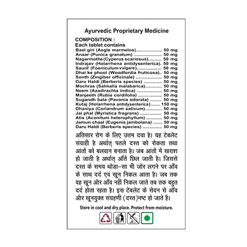• The ingredients of the tablet combination is Bael Giri (Aegle marmelos) Anaar (Punica granatum) Naagarmotha (Cyperus scariosus) Indrajav (Holarrhena antidysenterica) Saunf (Foeniculum vulgare) Dhai Ke Phool (Woodfordia fruticosa) Sonth (Zingiber officinal