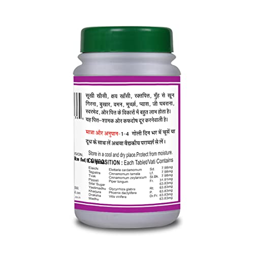 • In this combination there are potent substances of Basic Ayurveda Eladi Bati Elaichi Tejpatra Tavak Pippali Sita/Sugar Yastimadhu Kharjura Draksha Madhu.