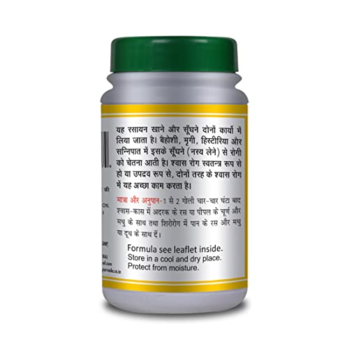 • This tablet is used for both eating and smelling. It is also used for smelling (taking Nasya). It works well in both types of respiratory problems whether independently or in a nuisance.
