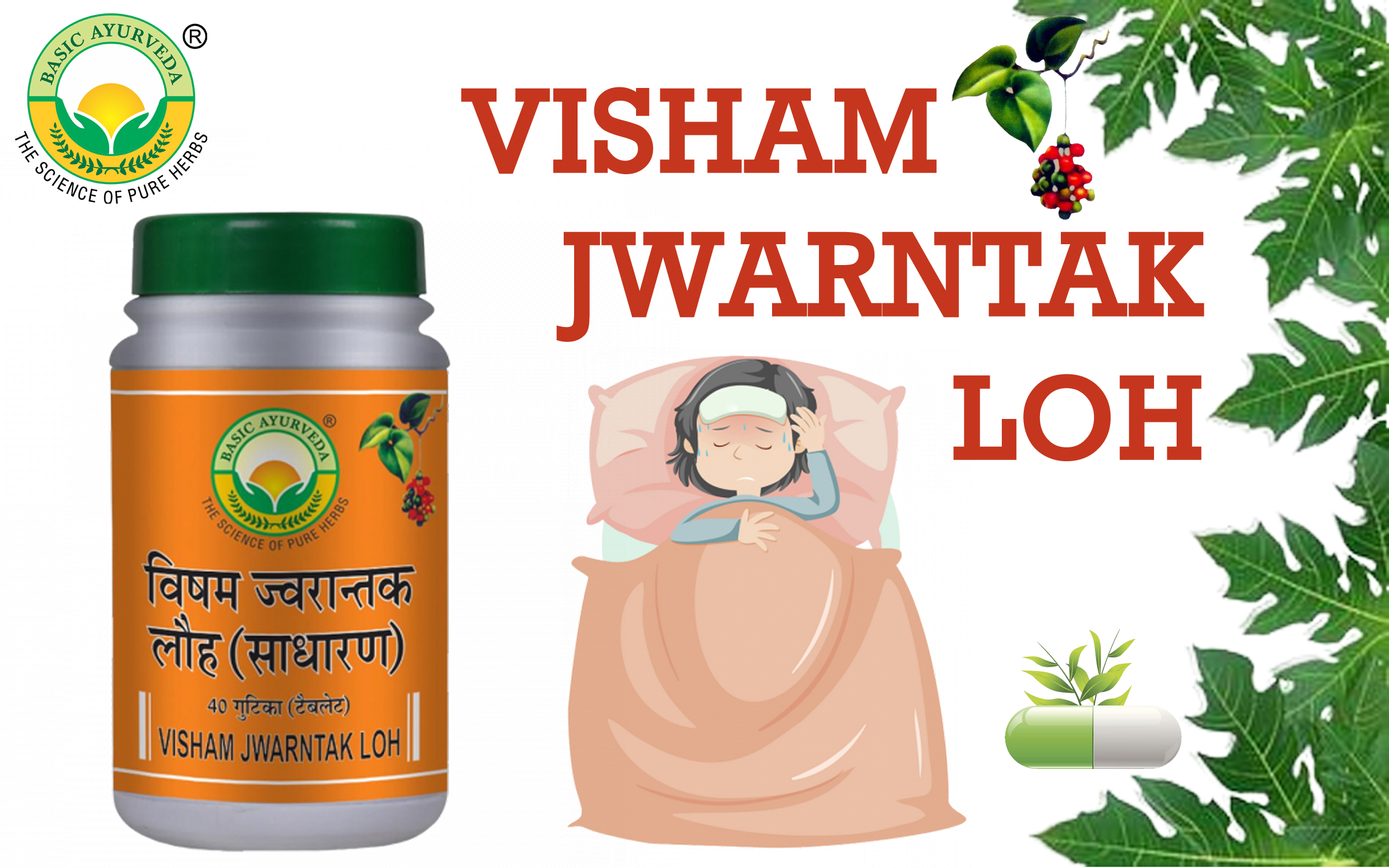 • Basic Ayurveda Visham Jwarantak Loh (Normal) is an ayurvedic herbomineral formulation of a tablet. The tablet is composed of herbs and bhasma that are in nature and help to bring down the temperature and also balance pitta and Kapha.