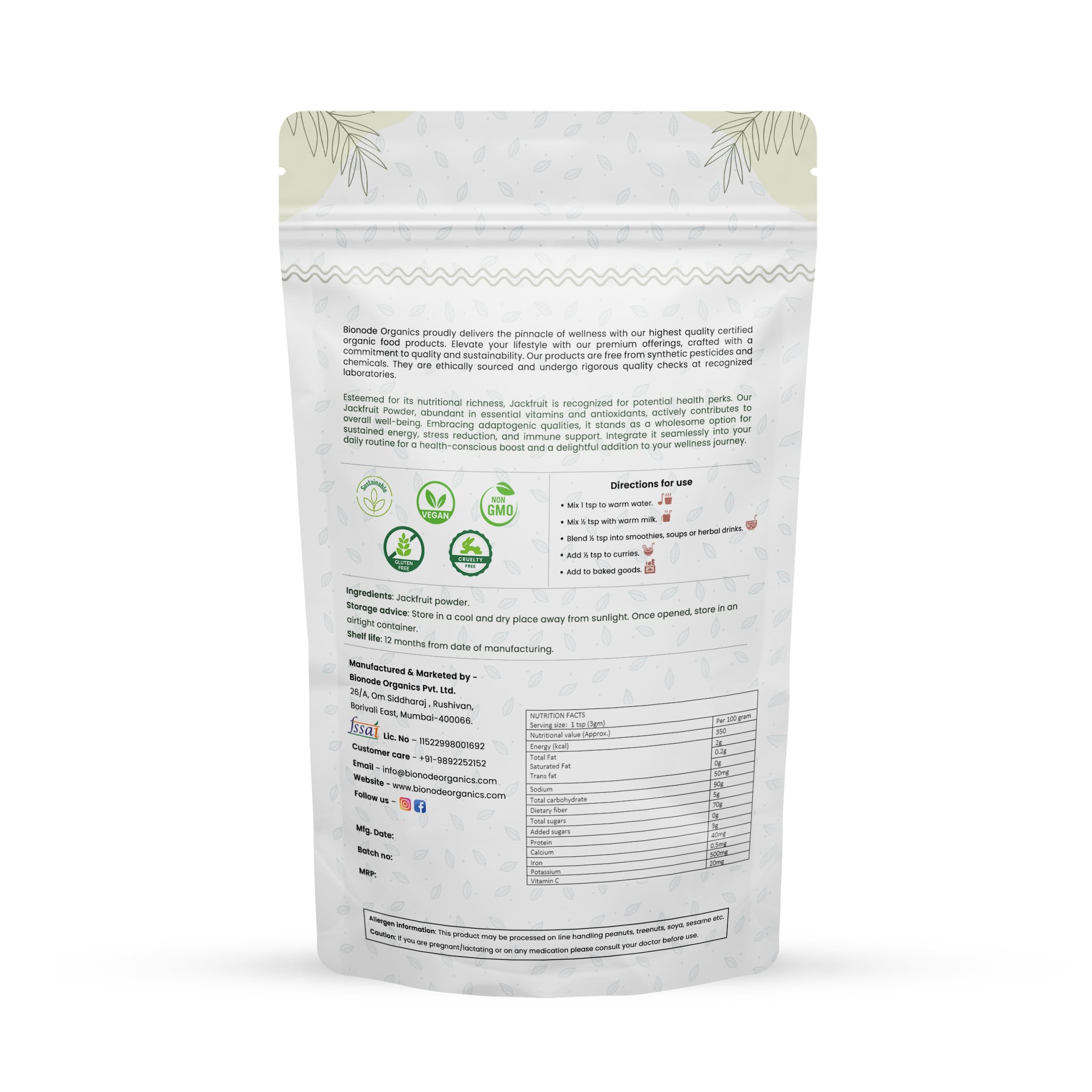 Introducing Bionode Organics' Jackfruit Powder derived from the ripe fruit of the jackfruit tree scientifically known as Artocarpus heterophyllus. Jackfruit holds a significant place in Ayurveda revered for its versatility and numerous health benefits. Bursting with benefits Jackfruit Powder is rich in essential nutrients including vitamins (such as vitamin C vitamin A and vitamin B6) minerals (including potassium magnesium and manganese) antioxidants and dietary fiber. Its therapeutic effects encompass digestive support immune boosting energy enhancement and skin rejuvenation. Organically grown and free from synthetic substances our Jackfruit Powder embodies the purity and potency of nature. Embrace holistic well-being naturally with Bionode Organics' premium Jackfruit Powder your ultimate source of vitality and rejuvenation.