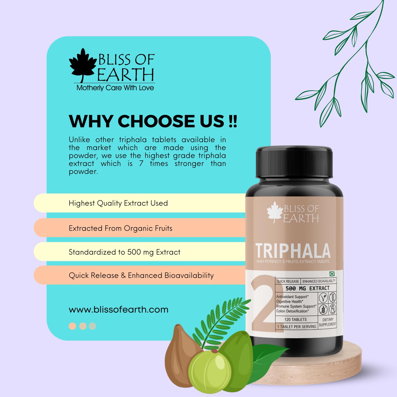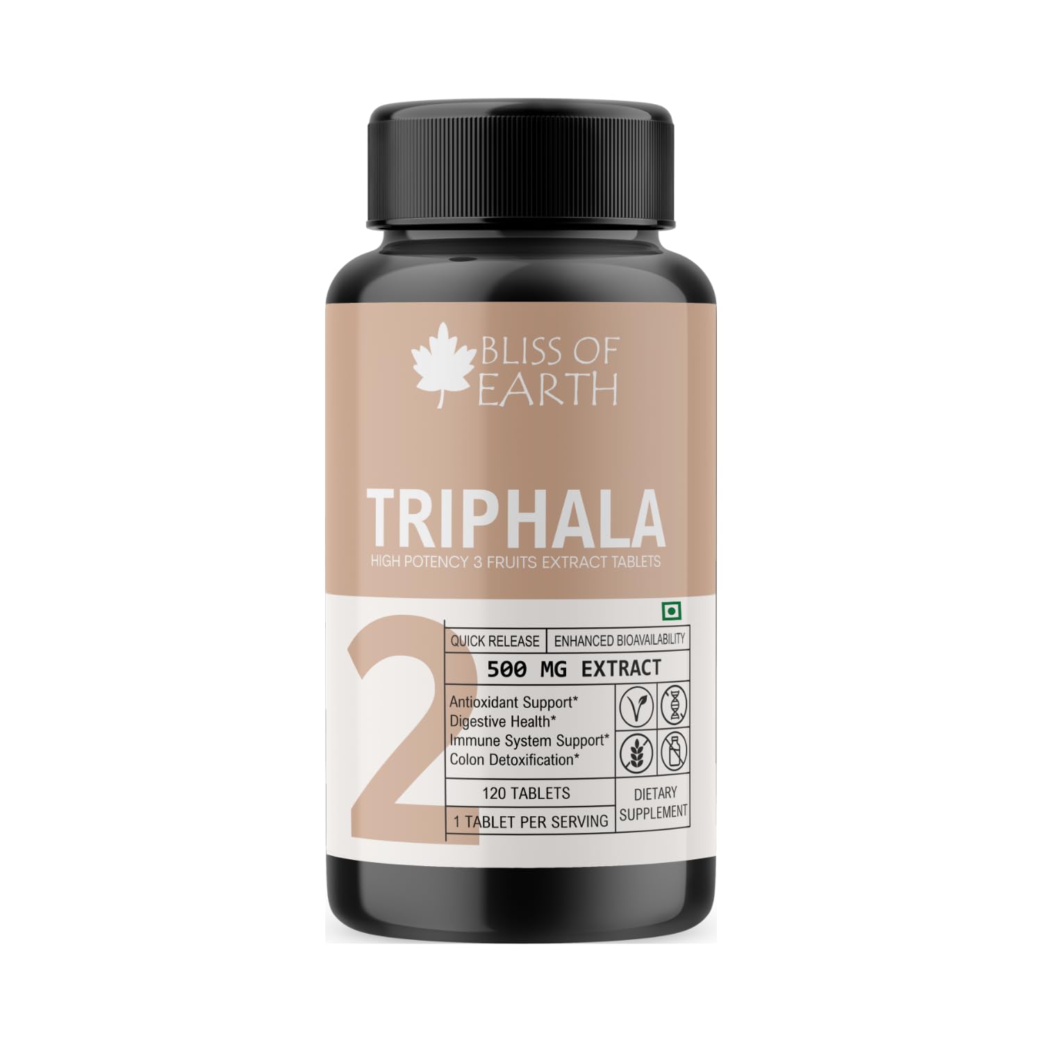 Discover the time-honored secret of Triphala with Bliss of Earth Triphala Extract Tablets. Triphala a blend of three powerful Ayurvedic fruits - Amla (Indian Gooseberry) Haritaki (Terminalia chebula) and Bibhitaki (Terminalia bellirica) has been cherished for centuries for its digestive health benefits. These 500mg tablets offer a convenient and effective way to support your digestive system and alleviate constipation.