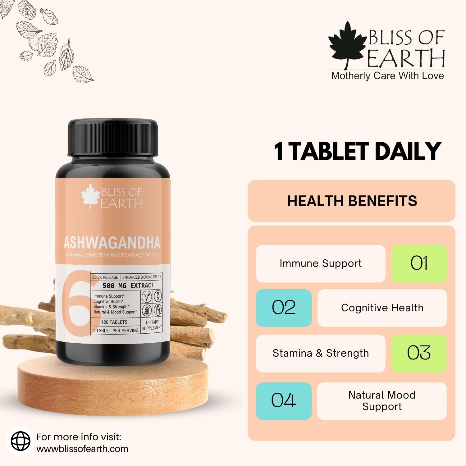 Unlock the power of nature with Bliss of Earth Turmeric Curcumin 500mg tablets a natural supplement designed to promote joint health and support a healthy inflammatory response. These tablets feature a potent dose of curcumin the active compound found in turmeric renowned for its potential health benefits. Experience the quick release and enhanced bioavailability for maximum effectiveness. & Bliss of Earth Ashwagandha scientifically known as Withania somnifera is a renowned adaptogenic herb with a long history of use in traditional Ayurvedic medicine. These Ashwagandha tablets offer a convenient and standardized way to incorporate the numerous potential health benefits of this herbal remedy into your daily routine.