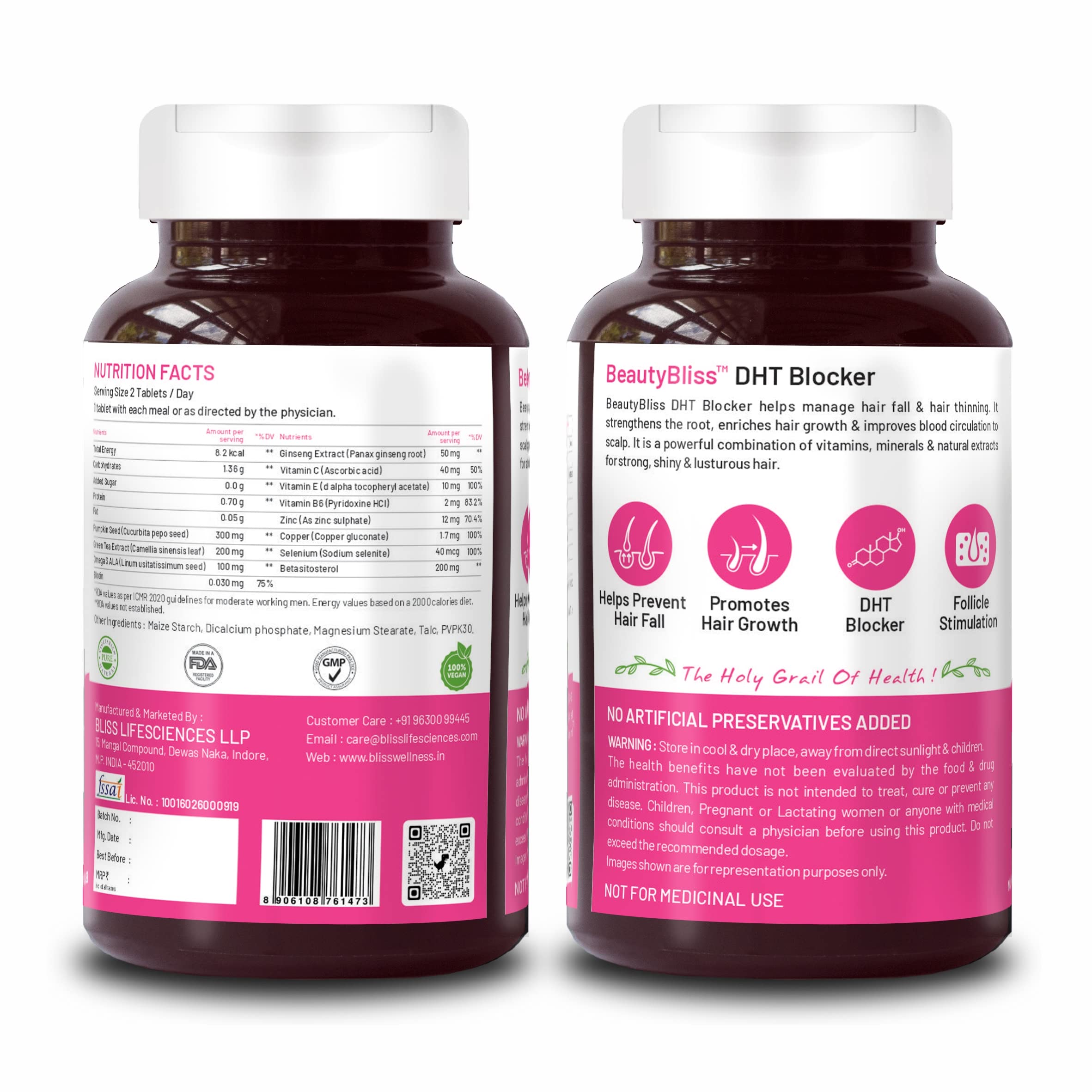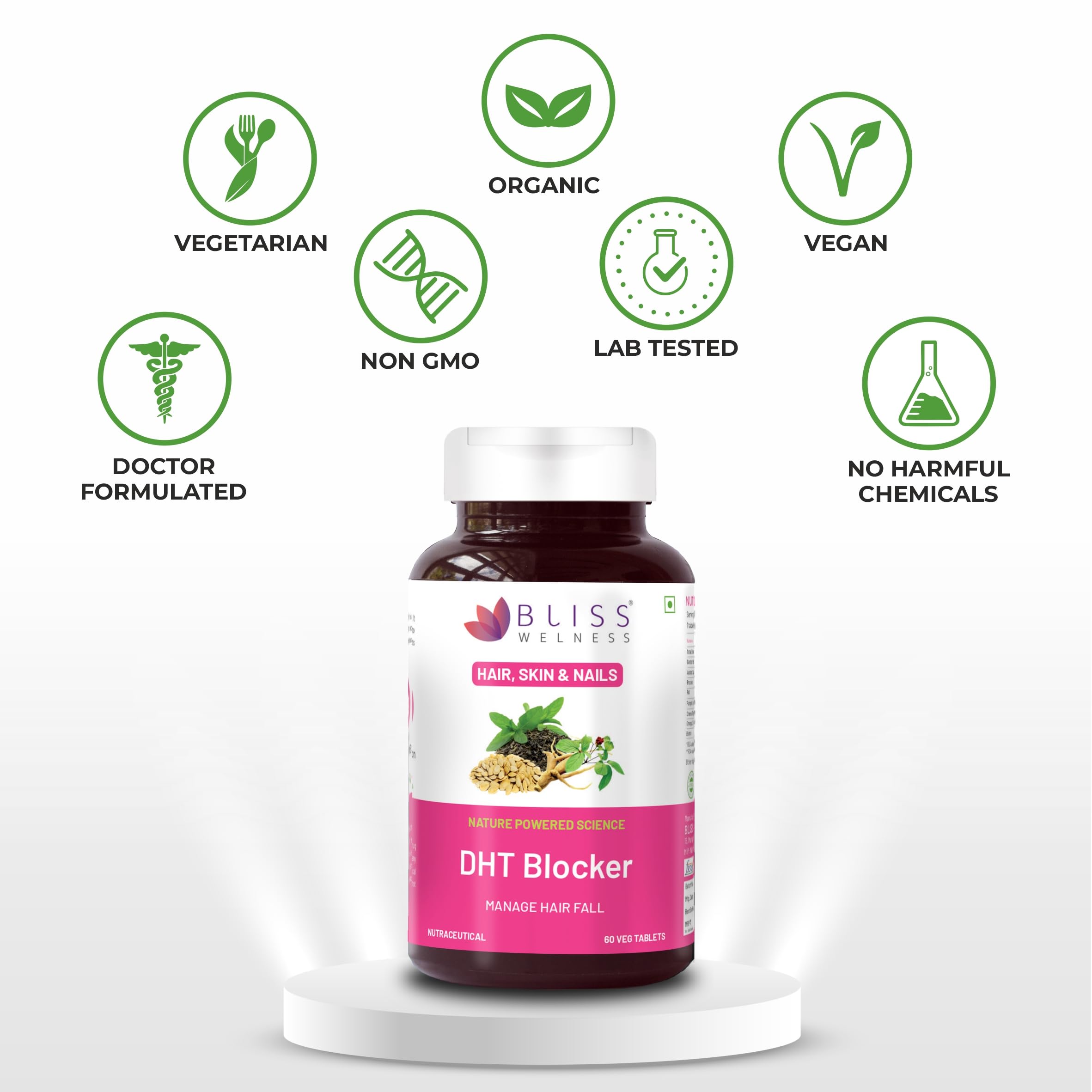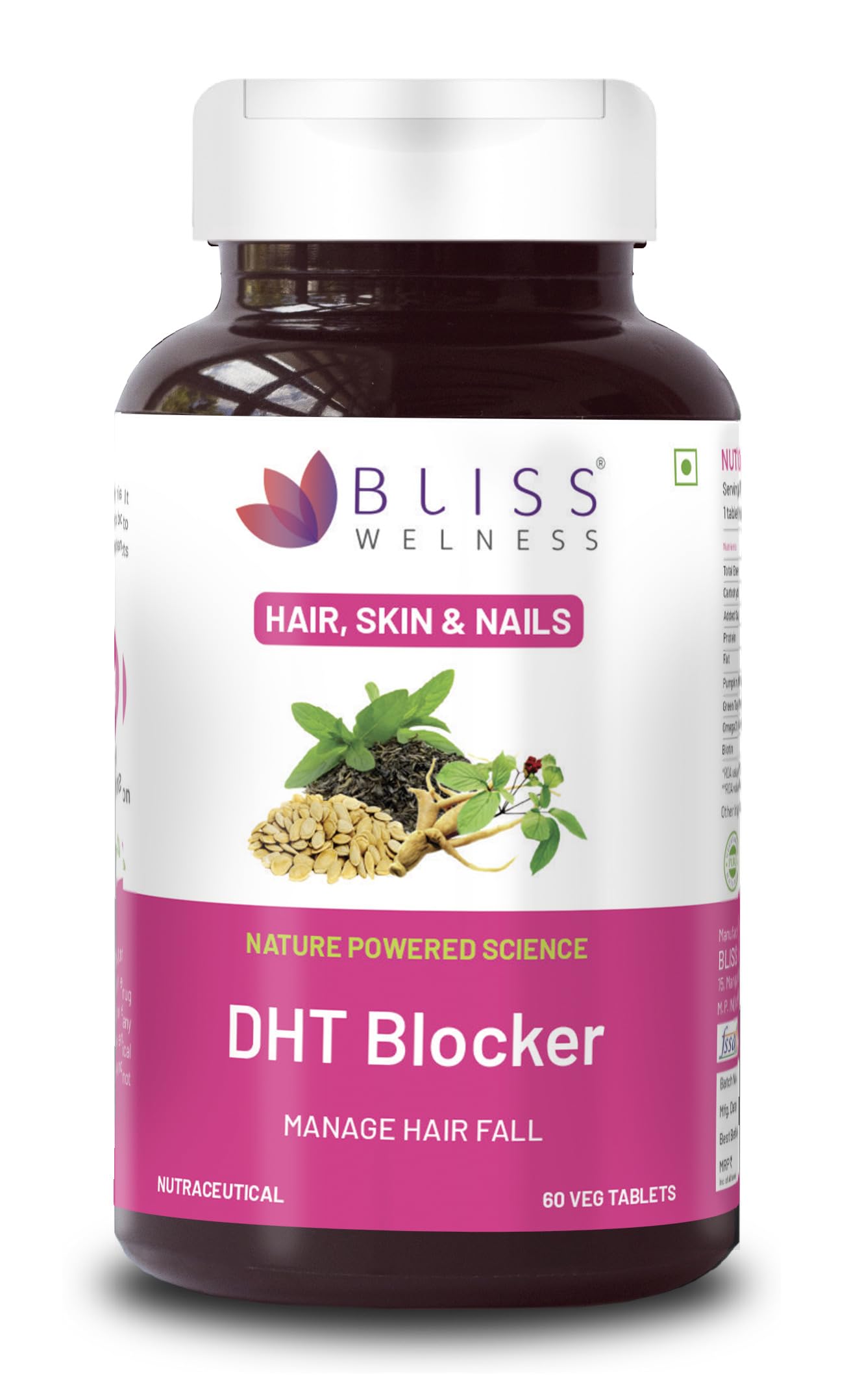 Bliss Wellness DHT Blocker with Biotin Pumpkin Seed Green Tea Omega-3 Vitamins C E B6 Zinc Selenium & Beta-Sitosterol Reduces Hair Fall Stimulates Growth & Regrowth 60 Veg Tablets.