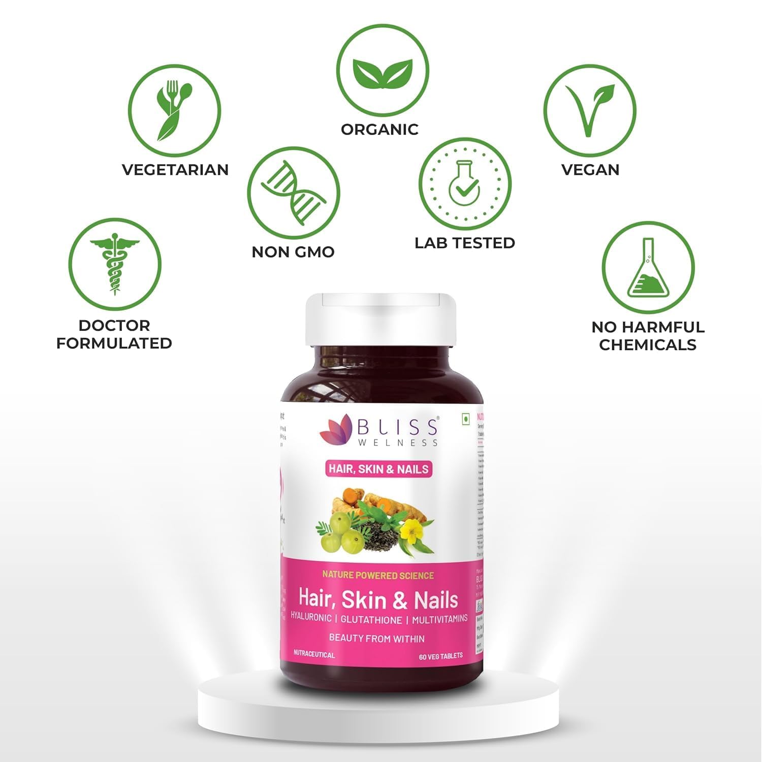 Bliss Welness Hair Skin Nails Multivitamins with Hyaluronic Acid Glutathione Biotin | Improved Hair Growth Stronger Nails Glowing Skin Collagen Supplement for Women & Men - 60 Vegetarian Tablets