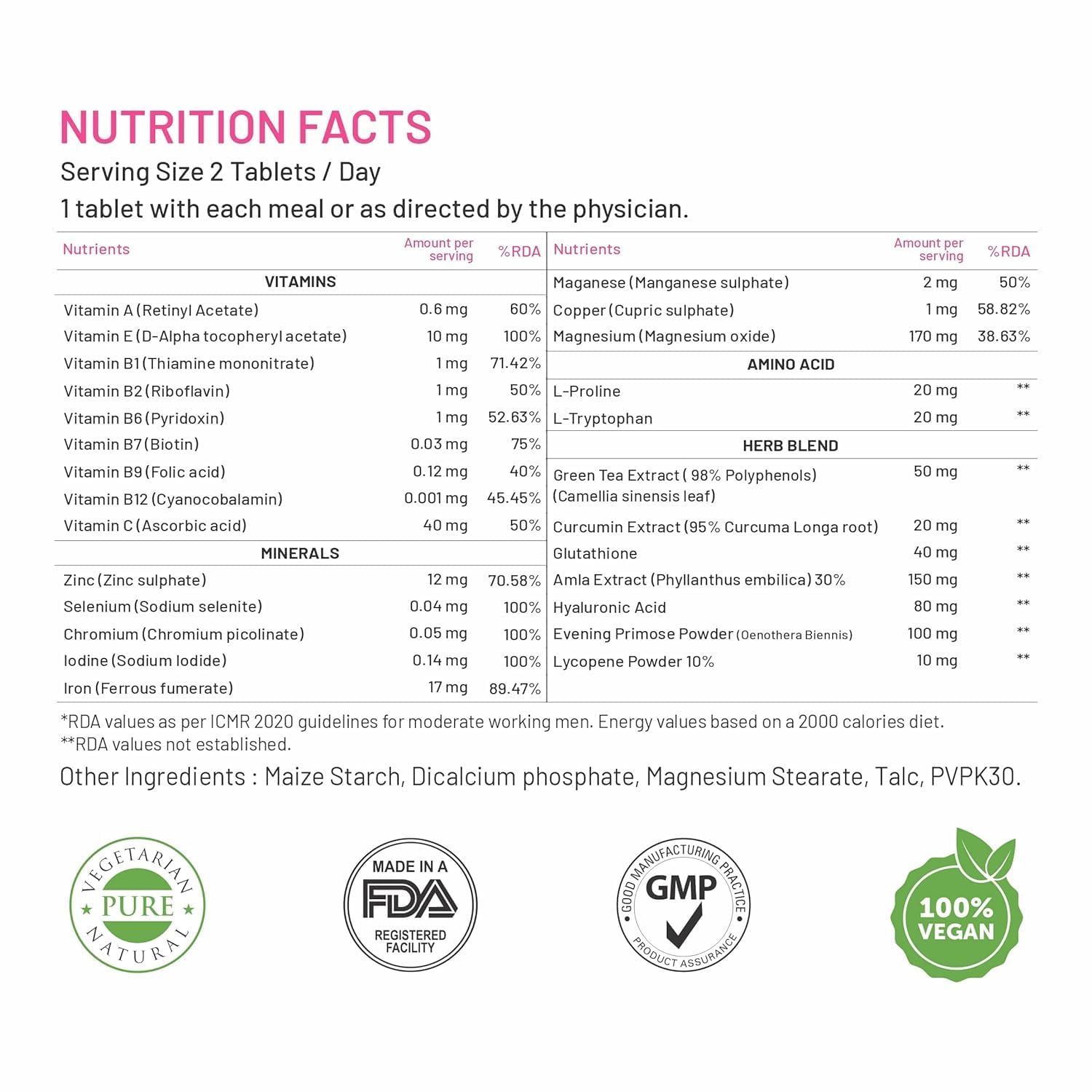 360°BEAUTY BOOSTER : Fortified with green tea extract which detoxifies blood enhances skin health & improves skin glow. Biotin intake prevents brittle nails skin issues and hair loss. Curcumin along with multivitamins supports treatment of skin infection