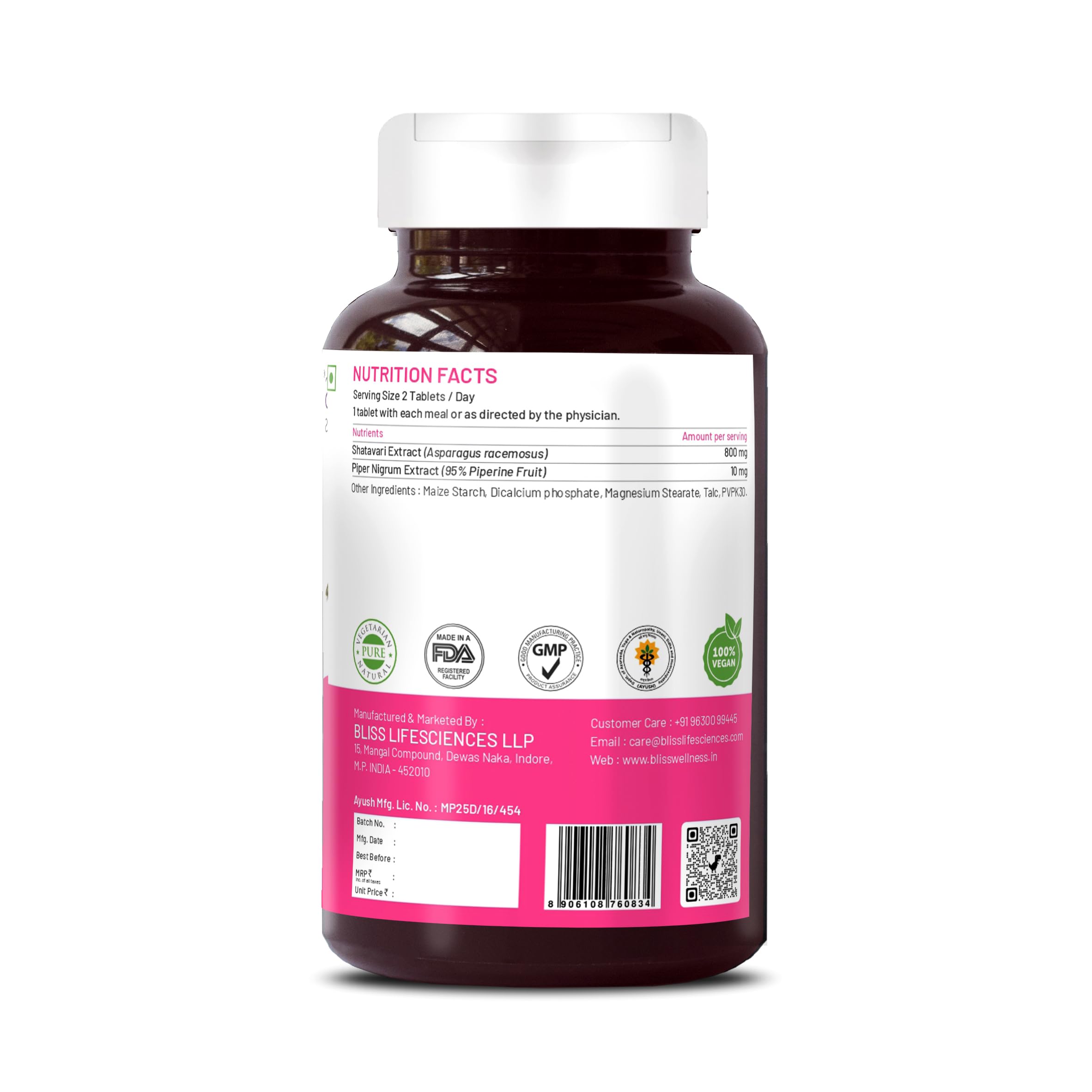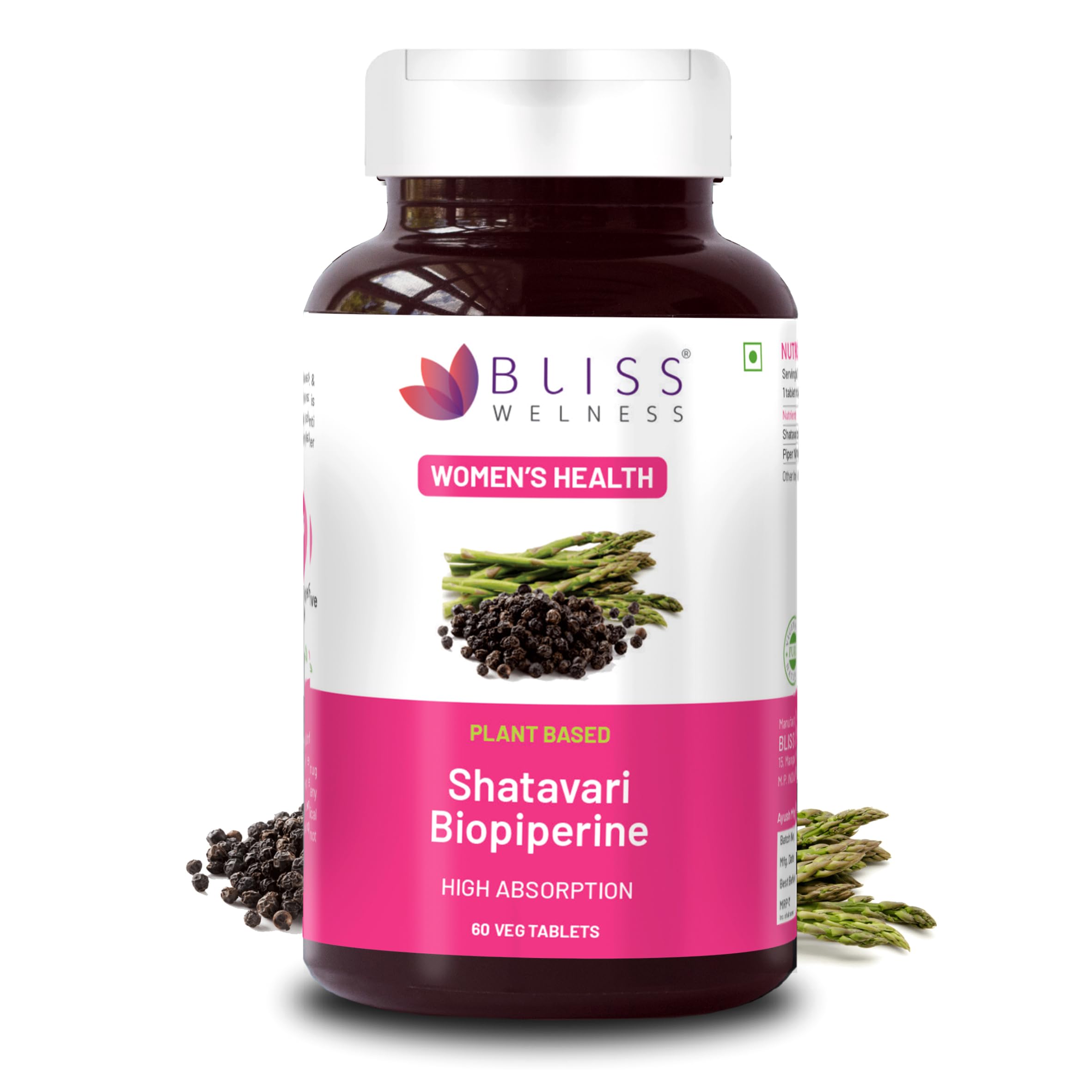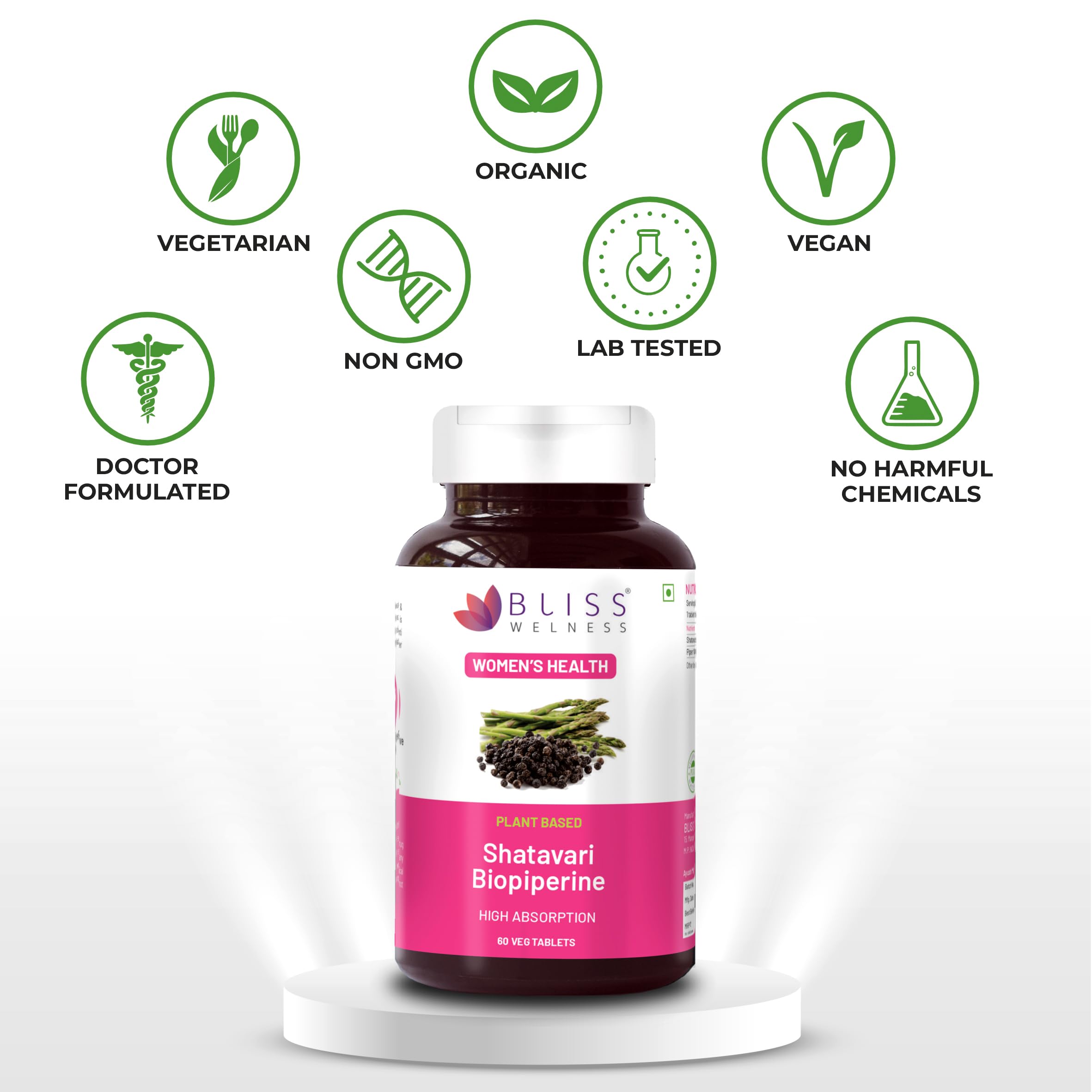 Bliss Welness Organic Shatavari Biopiperine | Women Health | Lactation Support Immunity Booster Menopause Support Vegetarian Supplement - 60 Tablets