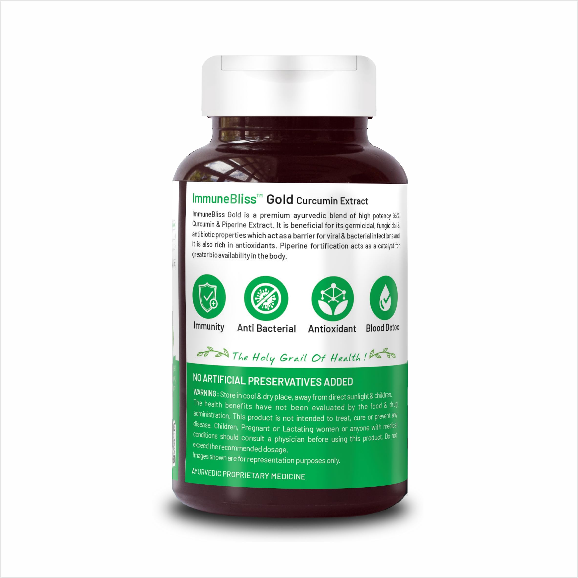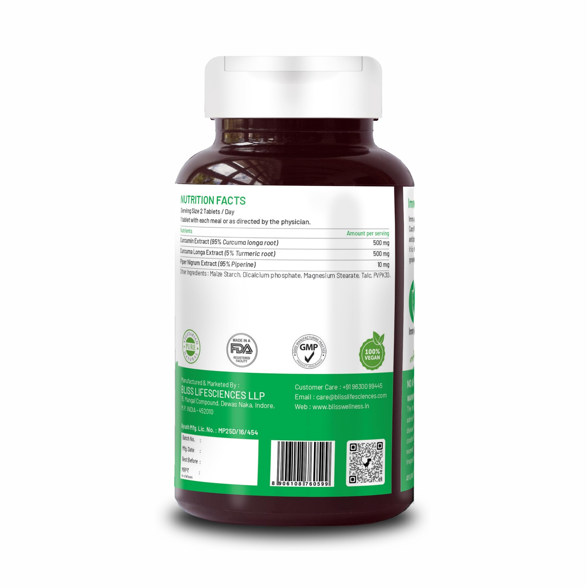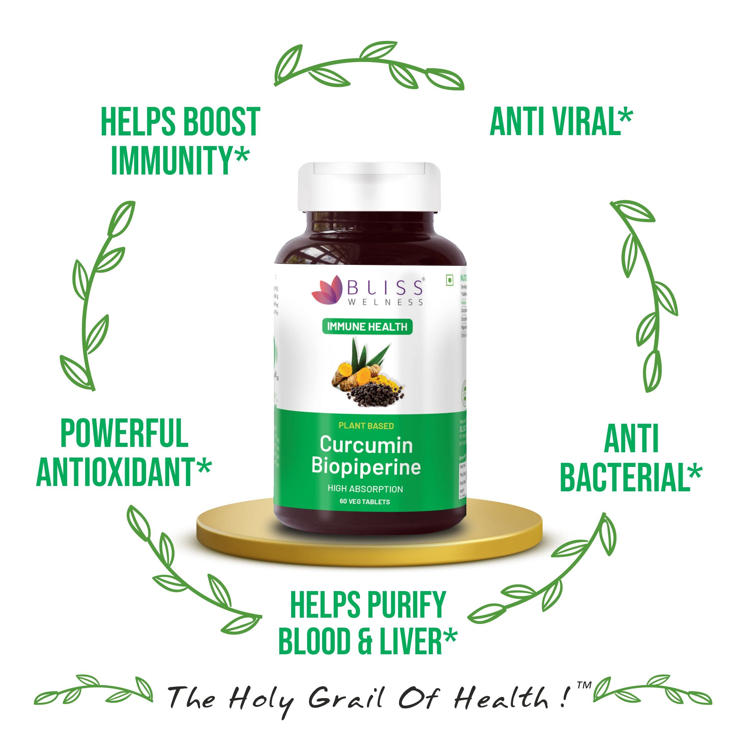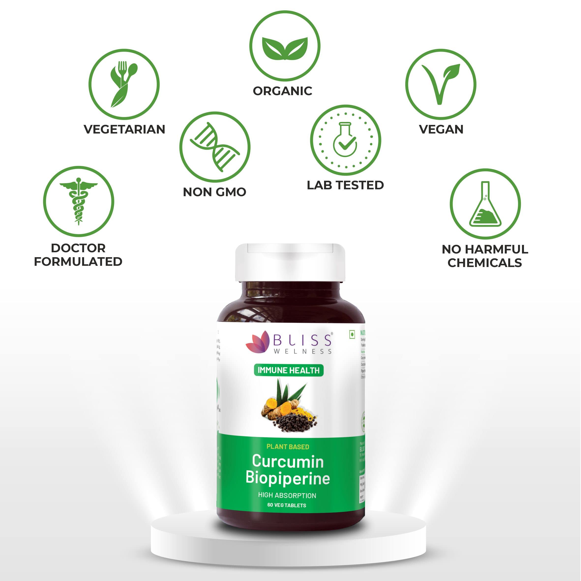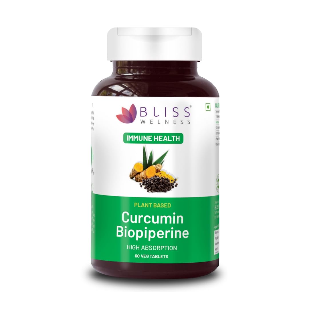 Bliss Welness Plant Based Curcumin with BioPiperine 95% (1000Mg) Supplement for High Absorption | For Joint Pains Skin Health | Immunity Booster For Men And Women- 60 Vegetarian Tablets