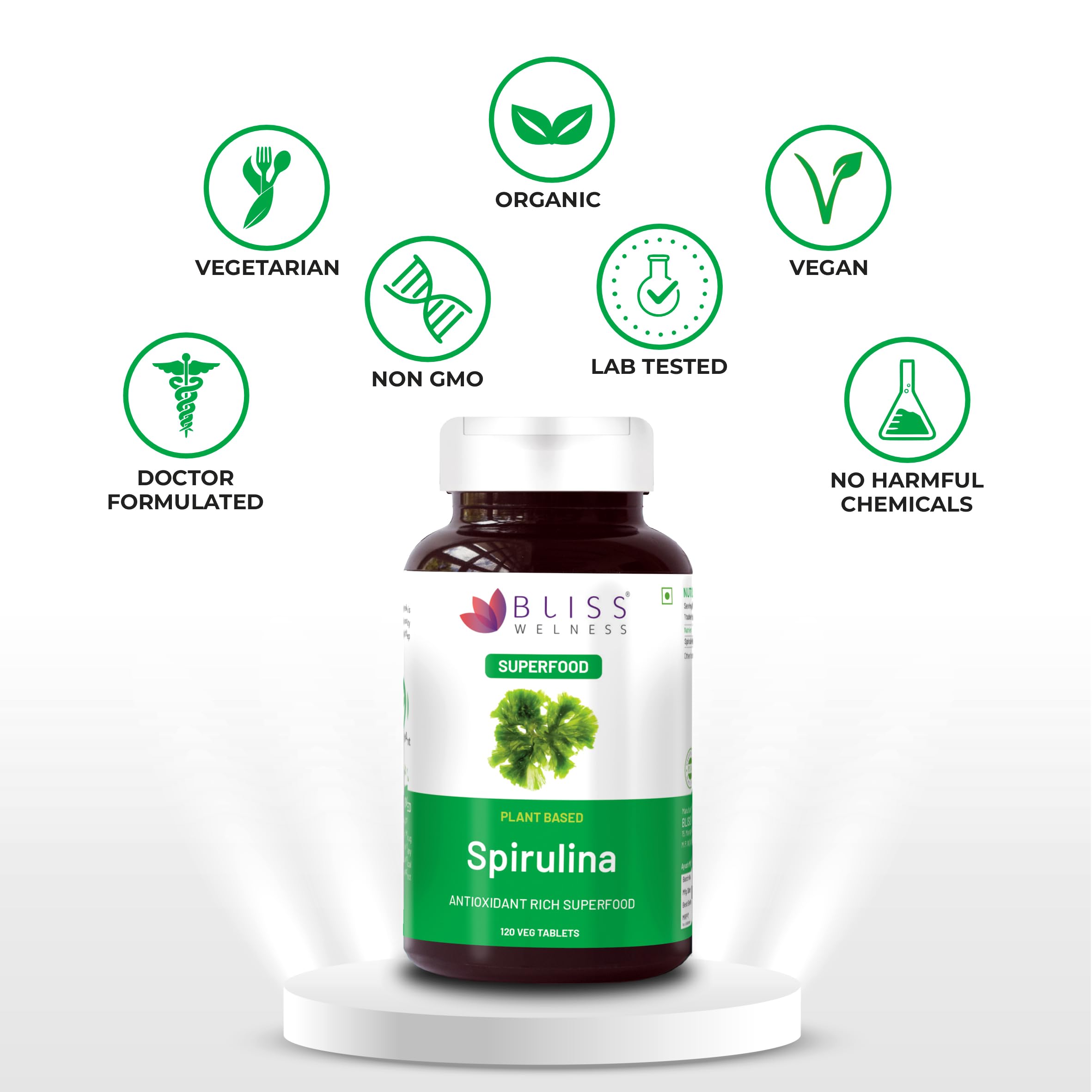 Bliss Welness Spirulina 1000 MG Daily Superfood Immunity Booster with Rich Antioxidant High Energy Detox Vegetarian Health Supplement - 120 Tablets