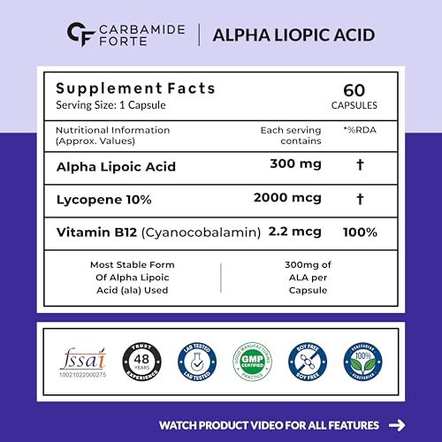 Carbamide Forte Alpha Lipoic Acid 300mg - ALA Capsules with Vitamin B12 & Lycopene | ALA Supplement | Supports Healthy Skin & Immunity - 60 Veg ALA Capsules