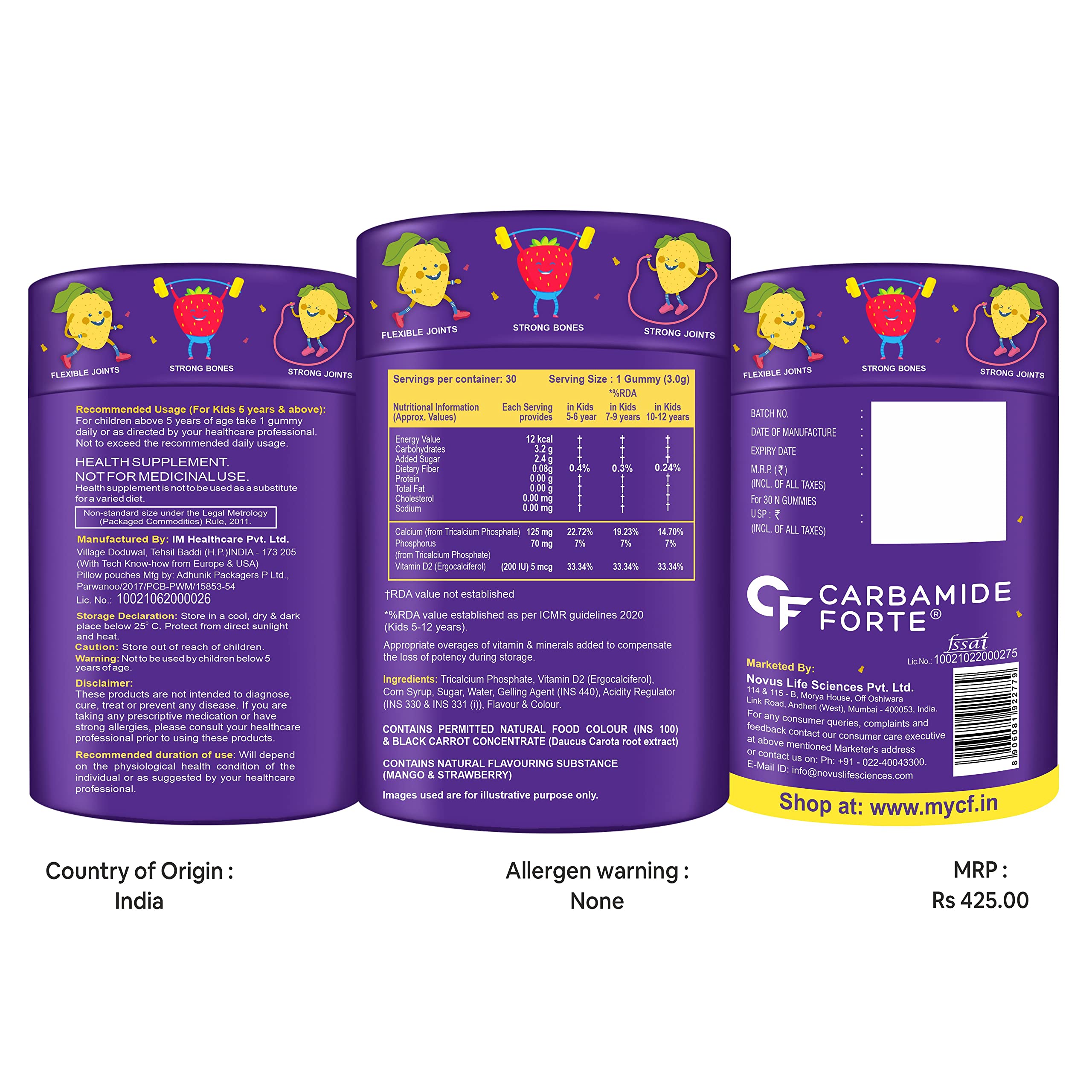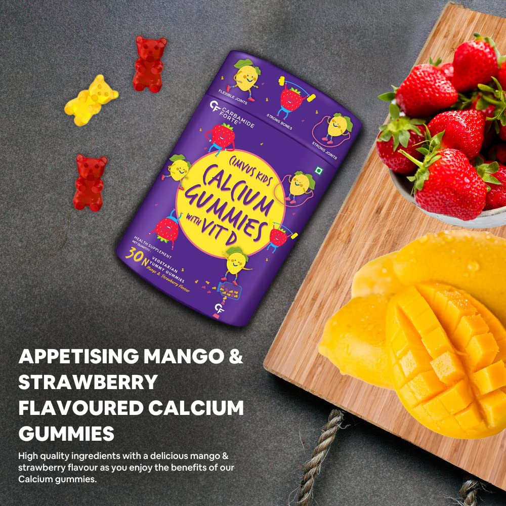 Carbamide Forte Calcium with Vitamin D Gummies for Kids | Calcium Gummies for Kids for Stronger Bones Joints & Teeth & Immunity - Mango & Strawberry Flavour - 30 Veg Gummies