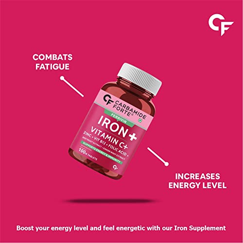Carbamide Forte Iron Supplement for Women & Men | Folic Acid Tablets with Vitamin C, B12, Zinc | 100 Veg Iron Tablets for Women & Men