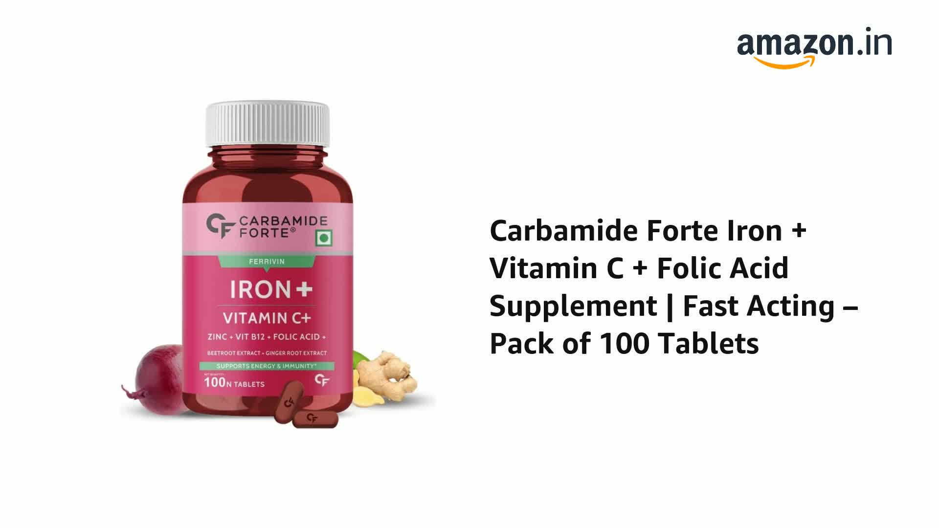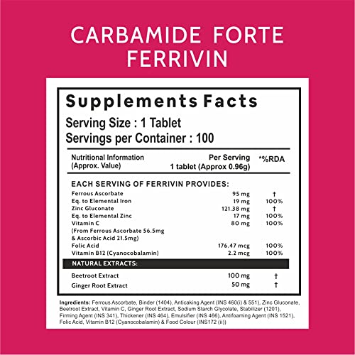 Carbamide Forte Iron + Vitamin C + Folic Acid Supplement | Fast Acting Pack of 100 Tablets