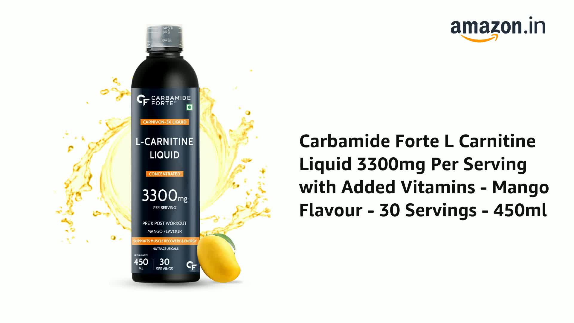 HomeHealth & PersonalDiet & NutritionHealth SupplementsCarbamide Forte L Carnitine Liquid 3300mg | L-Carnitine Supplement For Men & Women | Liquid L Carnitine Pre Workout, Intra Workout & Post Workout Supplement With 3300 mg Per Serving With Added Vitamins | L'Carnitine Mango Flavour With 30 Servings - 450ml