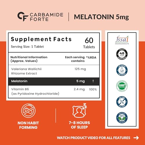 HomeHealth & PersonalDiet & NutritionHealth SupplementsCarbamide Forte Melatonin 5mg Sleep Tablets – Sleeping Pills with 125mg Tagar & Vitamin B6 for Deep Sleep, Restful Nights, and Effective Sleep Dose | Sleeping Tablets for Women & Men – 60 Veg Tablets