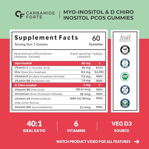 HomeHealth & PersonalDiet & NutritionHealth SupplementsCarbamide Forte PCOS Supplements for Women with 40:1 Ratio of Myo Inositol to D Chiro Inositol | Inositol Supplement for PCOS - 60 Veg Orange Flavoured Gummies, 275 Grams