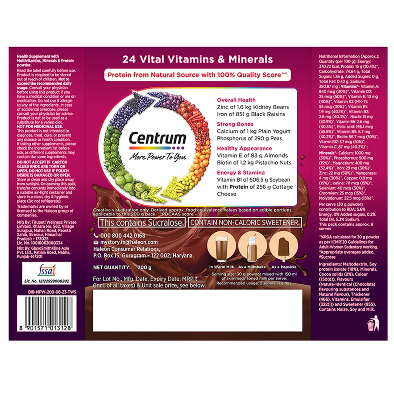 Do you want to live your multilife with confidence and feel the best version of yourself? Look no further! Centrum presents Centrum Women Multivitamin & Protein a multivitamin multimineral powder to meet your daily nutrition needs. Your daily dose of tasty nutrition is formulated with 24 Vital Vitmains and Minerals. Centrum formulations have been tailormade for Indian diets and body needs. Zinc Iron support Overall Health and Calcium Phosphorus strengthen Bones. Biotin Vitamin E aid Hair and Skin Health. Nutrients such as Vitamin B1 Protein boost Energy and Stamina. Centrum Women Multivitamin & Protein is 100% vegetarian. You can refer pack for usage and administration instructions or can consult your health care practioner. For storage conditions please refer the pack. For references please refer to Centrum India's website.