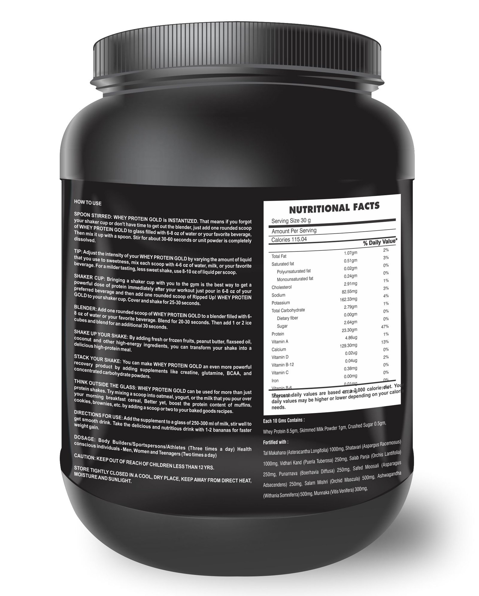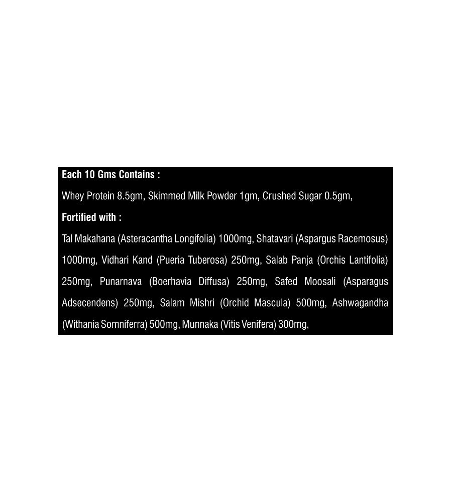 Ingredients (each 10 gms): whey protein 8.5 gm skimmed milk powder 1 gm crushed sugar 0.5 gm. Fortified with: tal makahana(asteracantha longifolia) 1000 mg shatavar(asparagus racemosus) 1000 mg vidhari kand(pueria tuberosa) 250 mg salab panja(orchis lantifolia) 250 mg punarnava(boerhavia diffuse) 250 mg safed moosali(asparagus adsecendens) 250 mg salam mishri(orchid mascula) 500 mg ashwagandha(withania somniferra) 500 mg munnaka(vitis venifera) 300 mg.