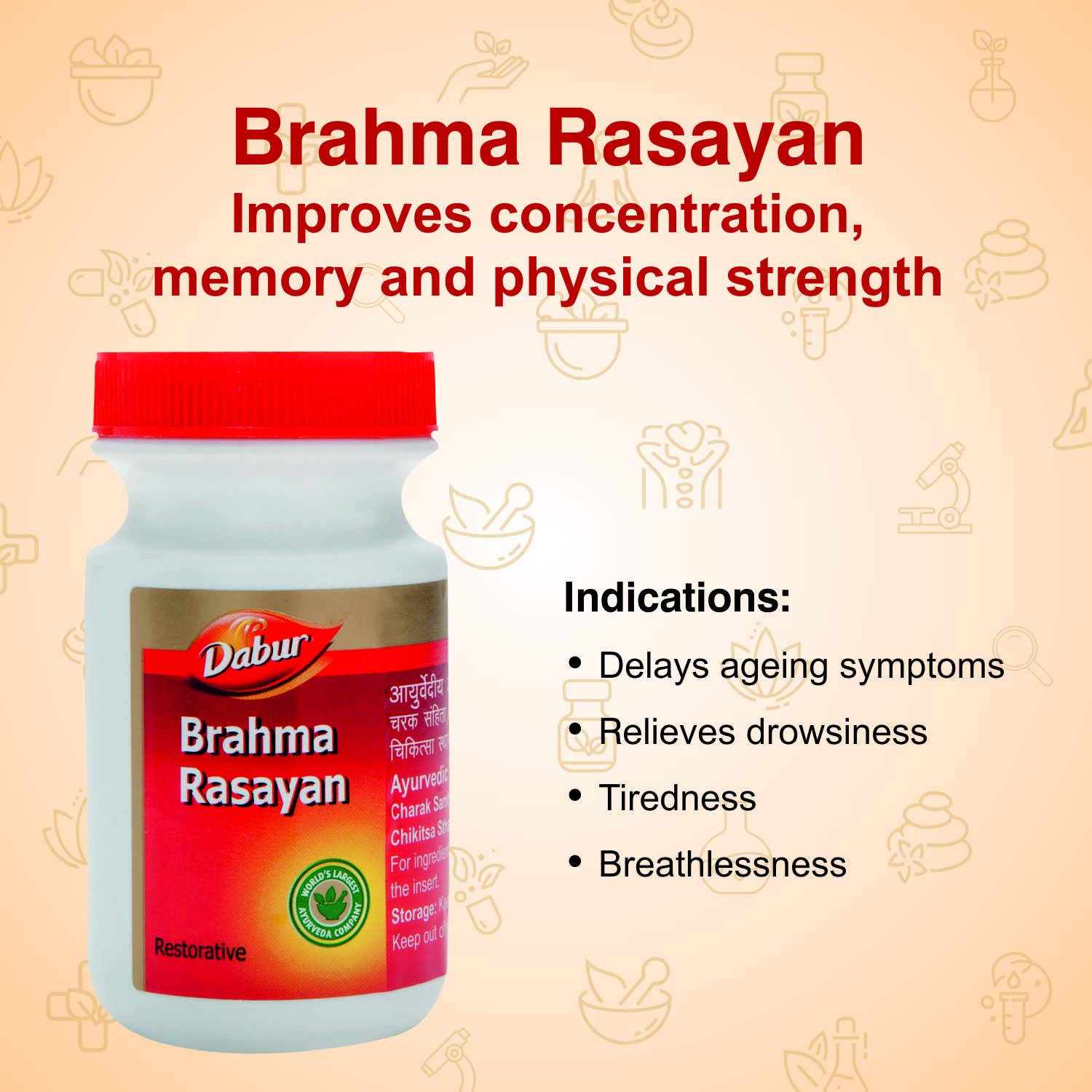 Dabur Brahm Rasayan is an ayurvedic remedy that improves memory mental strength cognition immunity general well-being etc. It is regarded as an excellent cerebral tonic. It is a paste of herbs and fruits that provide essential nutrients required to increase brain power. The Rasayan can also improve physical strength and health upon regular consumption as it provides the essential energy that people require to lead a healthy life.
