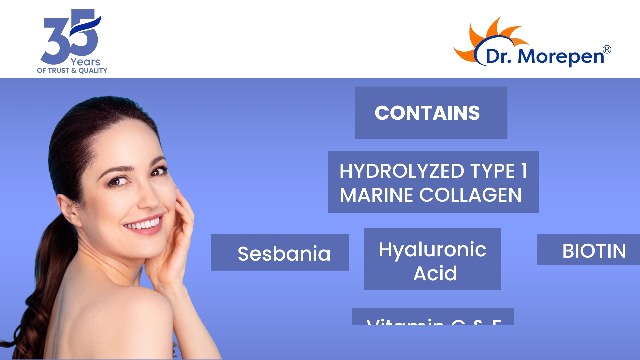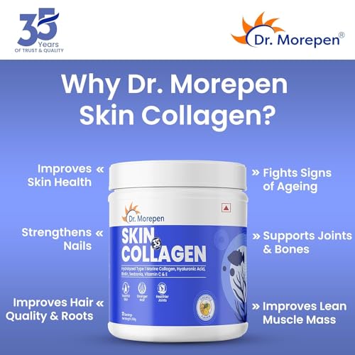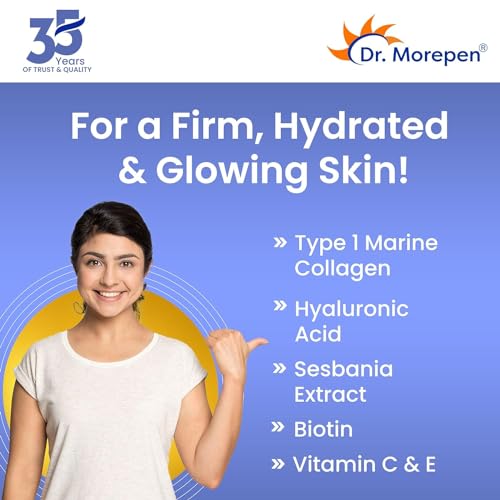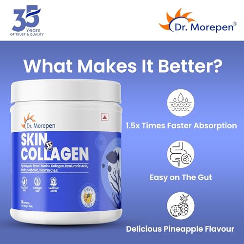 HIGHLY ABSORBABLE AND EASY TO DIGEST: Dr. Morepen Skin Collagen features Hydrolysed form of Collagen Protein (i.e. broken into tiny particles) which is highly bioavailable easy to digest and absorbs 1.5 times faster than other collagen forms. The absorpti