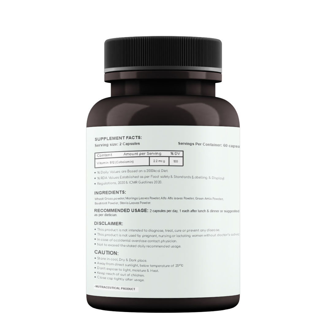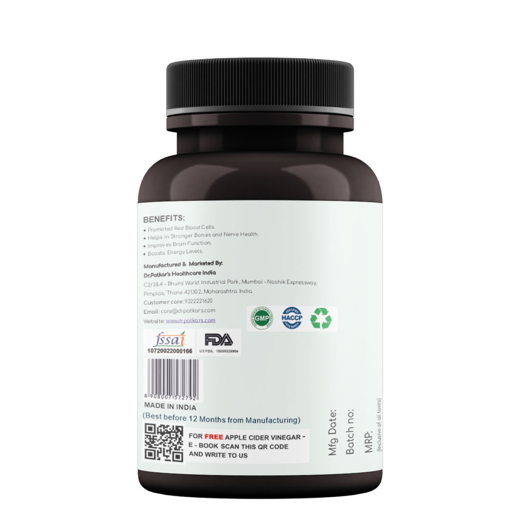 Dr. Patkars brings to you Plant-based Vitamin B12 to support various roles in your body. A Natural, Vegan, and Plant Based source made with an artistic blend of superfoods like Stevia Leaves, Alfalfa Leaves, Moringa, Wheat Grass, Green Amla & Beetroot, it fulfills your daily dose of Vitamin B12 in your body. As it's a plant-based source so easy for your gut to digest and absorb. Your body needs Vitamin B12 for the normal functioning of nerve cells, red blood cell formulation, boosting energy, DNA synthesis, and improving memory. Experience healthy days by incorporating these Dr. Patkars Vitamin B12 capsules into your daily life! INGREDIENTS: Plant-based extracts for all-natural nourishment! Beetroot Rich in essential nutrients and low in calories, beetroot helps manage blood pressure, improves athletic performance, increases platelets, and boosts digestive health, along with several other benefits. Moringa Packed with antioxidants and bioactive compounds, Moringa regulates blood sugar levels, manages inflammation, improves fertility, and boosts immunity. Wheatgrass A superfood, wheatgrass helps eliminate toxins, anti-cancerous, improves digestion, and boosts your metabolism. Alfalfa Rich in oxidants and vitamins, Alfalfa lowers blood cholesterol and promotes good nerve health. Green Amla Rich in antioxidants, Amla improves immunity, fastens metabolism, detoxifies the body, and supports digestive health. Dosages: 2 capsules per day, 1 each after lunch & dinner or suggested as per dietician. Benefits: IMMUNE SYSTEM: This supplement is a blend of natural ingredients like Amla, Wheatgrass, and Beetroot, known to have a positive impact on your immunity. It safeguards against harmful molecules, encourages healthy immune cells, boosts metabolism, promotes vitality, assists in detoxification, and enhances your immune system. ANTIOXIDANT RICH: By nature, different ingredients in these capsules have antibacterial, antioxidant, and anti-inflammatory properties that manage inflammation, combat oxidative stress & guard against free radicals in the body and promote a healthy self! HEALTHY RBC FORMULATION: It helps your body in the production of healthy red blood cells, reduces the alterations in RBCs due to deficiency, and ensures an adequate balance of RBCs for healthy functioning. SUPPORTS NERVE HEALTH: Dr. Patkars Plant-based Vitamin B12 has a perfect balance of natural ingredients that supply adequate Vitamin B12 essential for the functioning of the nervous system and guarding your nerves against damage-causing molecules. Reduce tingling sensation in nerves and issues like Sciatica. Apart from that, it also enhances cognitive functioning, balances blood sugar levels, and regulates cholesterol levels.