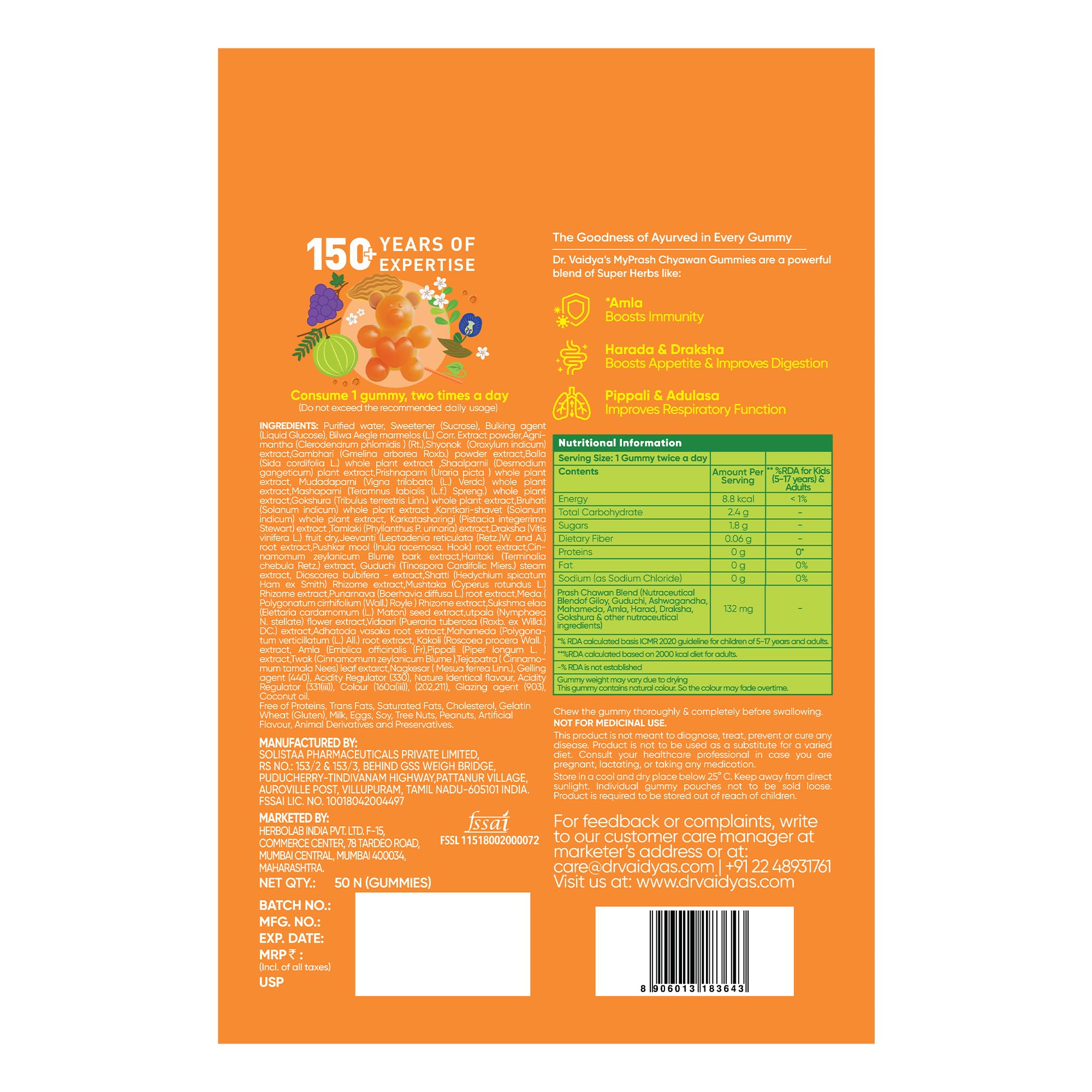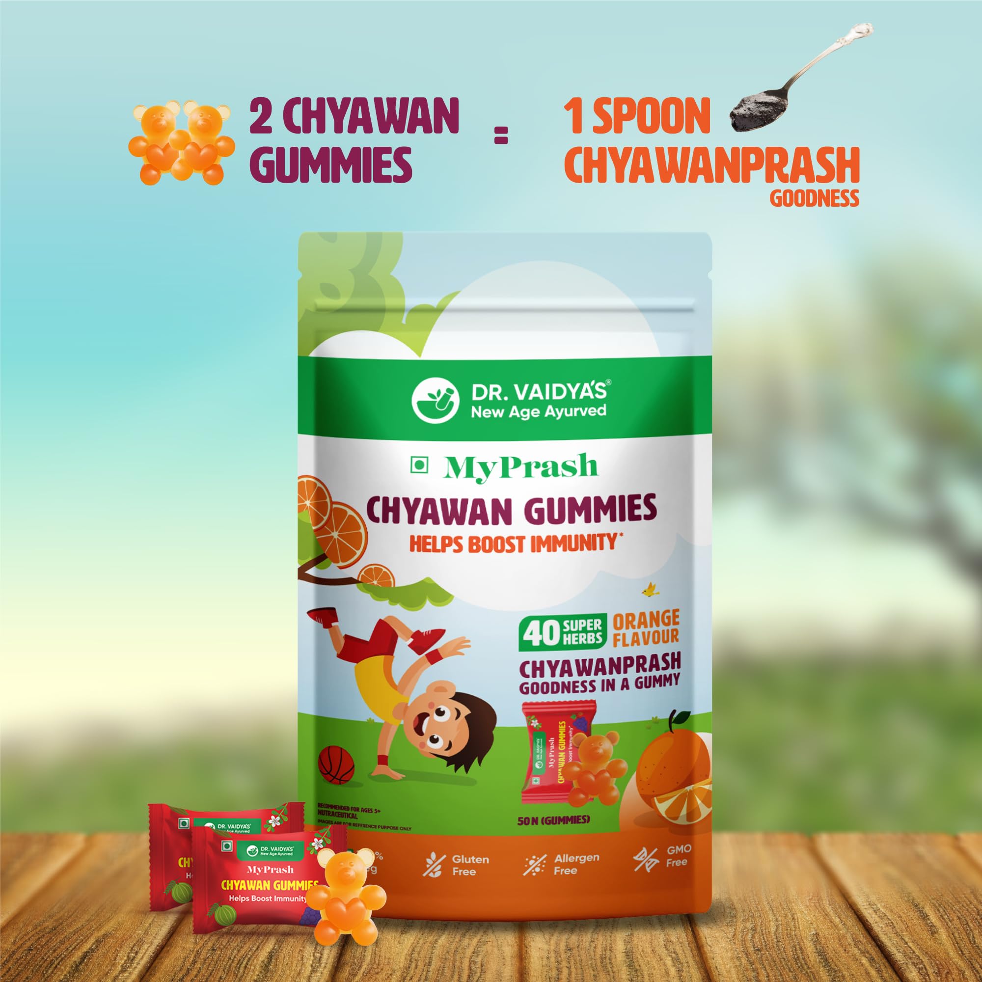 Earlier Chyawanprash was only available in its time-tested paste form. Now the Ayurvedic experts atDR. VAIDYA'S new age ayurveda have made the goodness of Chyawanprash more accessible with the new offering Chyawan Gummies. This yummy gummy is sure to make it easier for you to give your child the benefits of Chyawanprash without any fuss. Chyawan Gummies contains 40 super herbs found in Chyawanprash that are critical for kids' growing minds and bodies. These herbs are known to help boost immunity combat infections improve appetite support digestion and enhance respiratory function. Each gummy is also individually wrapped to make it convenient to add to your child's tiffin. Best of all two Chyawan Gummies provide similar health benefits as one teaspoon of traditional Chyawanprash. And not only kids but adults can also enjoy eating these gummies for the many health benefits of Chyawanprash. While the full list of super herbs in Chyawan Gummies can be found on the packaging there are 4 key ingredients in the gummies: â Amla helps boost long-term immunity â Harada helps support digestion and enhance appetite â Draksha (Grapes) help combat weakness and fatigue â Pippali helps support healthy respiratory function Here's why you should buy Chyawan Gummies: â Formulated by a team of Ayurvedic experts â Made with 100% Ayurvedic actives â Contain clinically researched ingredients â Does not contain metals artificial colours artificial flavours and harmful preservatives â Cause no known side effects â Safe for kids and adults